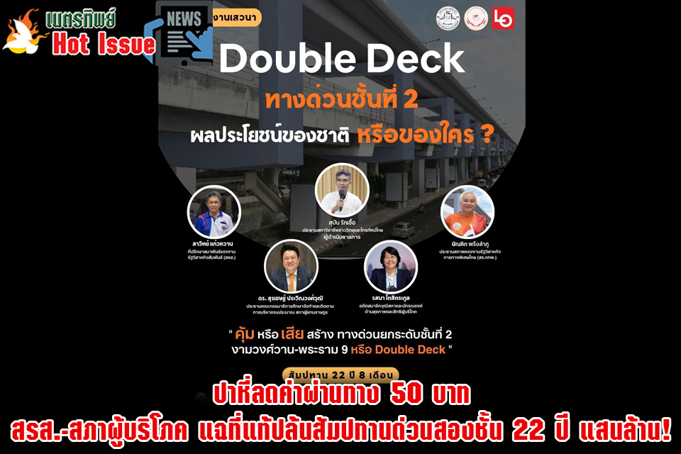 สหภาพแรงงานรัฐวิสาหกิจสัมพันธ์ ฝ่ายค้าน สภาผู้บริโภค ชำแหละดีลทางด่วน 2 ชั้น งามวงศ์วาน – พระราม 9 แลกลดค่าทางด่วน 50 บาท กับดักสัมปทาน 22 ปี เอื้อทุนใหญ่ ขวางพัฒนาระบบราง