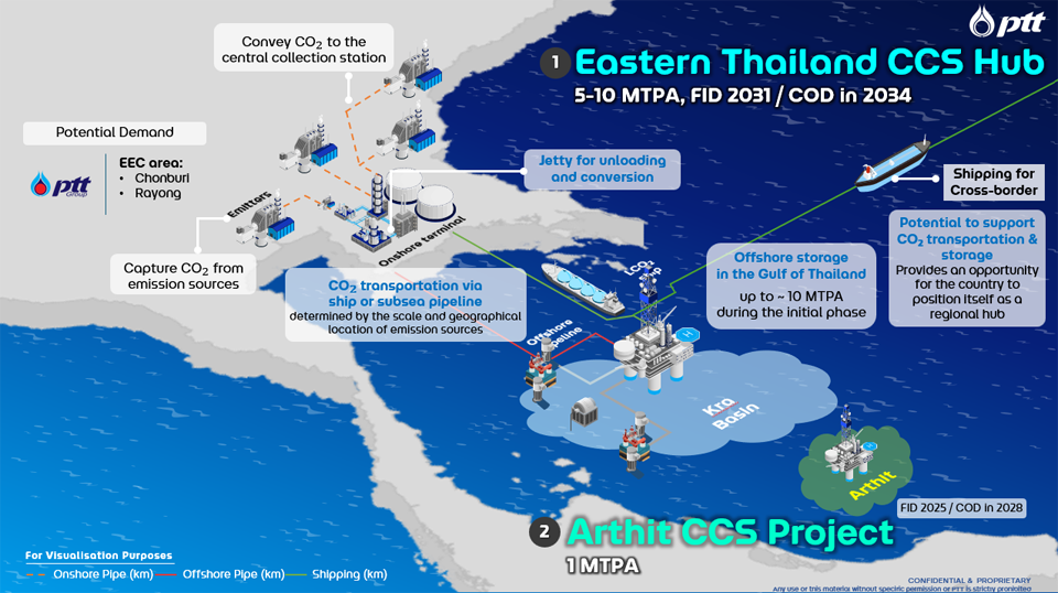 ในด้านการขับเคลื่อนความยั่งยืน ปตท. ยังคงมุ่งมั่นในการบรรลุเป้าหมาย Net Zero ภายในปี 2050 และจะลดการปล่อยก๊าซเรือนกระจกให้ได้ 15% ในปี 2035 โดยดำเนินการอย่างสมดุลในทุกมิติ ทั้ง เศรษฐกิจ สังคม และสิ่งแวดล้อม โดยหารือร่วมกับหน่วยงานภาครัฐ เพื่อกำหนดแนวทางส่งเสริมและผลักดันเทคโนโลยีดักจับและกักเก็บคาร์บอนไดออกไซด์ (CCS) ให้เกิดการใช้งานจริงในไทย พร้อมทั้งศึกษาและนำเสนอความเป็นไปได้ของการใช้ Hydrogen และ Ammonia Co-firing เป็นพลังงานทางเลือกในประเทศ ทั้งนี้ โครงการ CCS ที่แหล่งอาทิตย์ในอ่าวไทยจะเริ่มดักจับและกักเก็บคาร์บอนไดออกไซด์ในปี 2571 โดยสามารถกักเก็บได้สูงสุดประมาณ 1 ล้านตันต่อปี โครงการดังกล่าวจะเป็นต้นแบบสำคัญสำหรับการพัฒนา CCS ในพื้นที่อื่น ๆ ของประเทศไทย รวมถึงการพัฒนา CCS Hub ในเขตพัฒนาพิเศษภาคตะวันออกในอนาคต