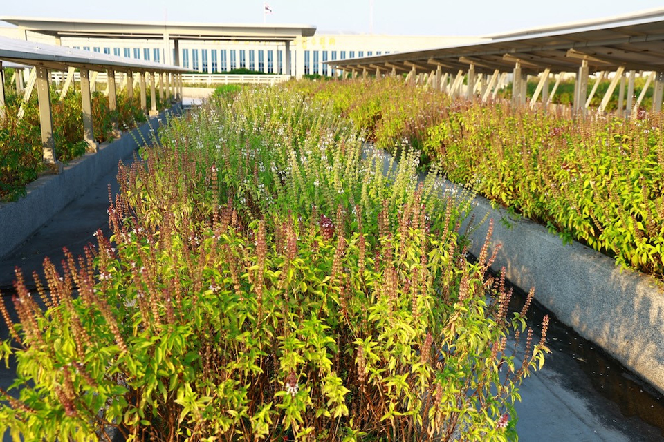 อีกหนึ่งกลยุทธ์สำคัญ คือ “From Grey to Green” ฟื้นระบบนิเวศผ่านสถาปัตยกรรม ปรับพื้นที่ดาดฟ้า อาคารจอดรถ A ขนาด 8,000 ตารางเมตร และเชื่อมต่อกับอาคารจอดรถ D จัตุรัสลอยฟ้า A-D หน้าบ้านใหม่ศูนย์ราชการเฉลิมพระเกียรติฯ ให้เป็นลานกิจกรรมกลางแจ้ง อาคารจอดรถเดิมถูกพัฒนาให้กลายเป็น ฟองน้ำยักษ์ (Sponge Parking) ที่กักเก็บและนำน้ำฝนกลับมาใช้ซ้ำแบบ Zero Runoff Discharge นอกจากนี้ยังพัฒนาพื้นที่บ่อน้ำเดิม 14 ไร่ให้กลายเป็น B-Park อุทยานลอยน้ำอาคาร B (B-Park Urban Floating Oasis) ด้วยพันธุ์ไม้พื้นถิ่น ช่วยลดอุณหภูมิรอบพื้นที่ได้สูงถึง 9°C แนวคิดนี้สะท้อนการออกแบบเชิงระบบนิเวศที่เน้น “การอยู่ร่วม” มากกว่าการแยกส่วน