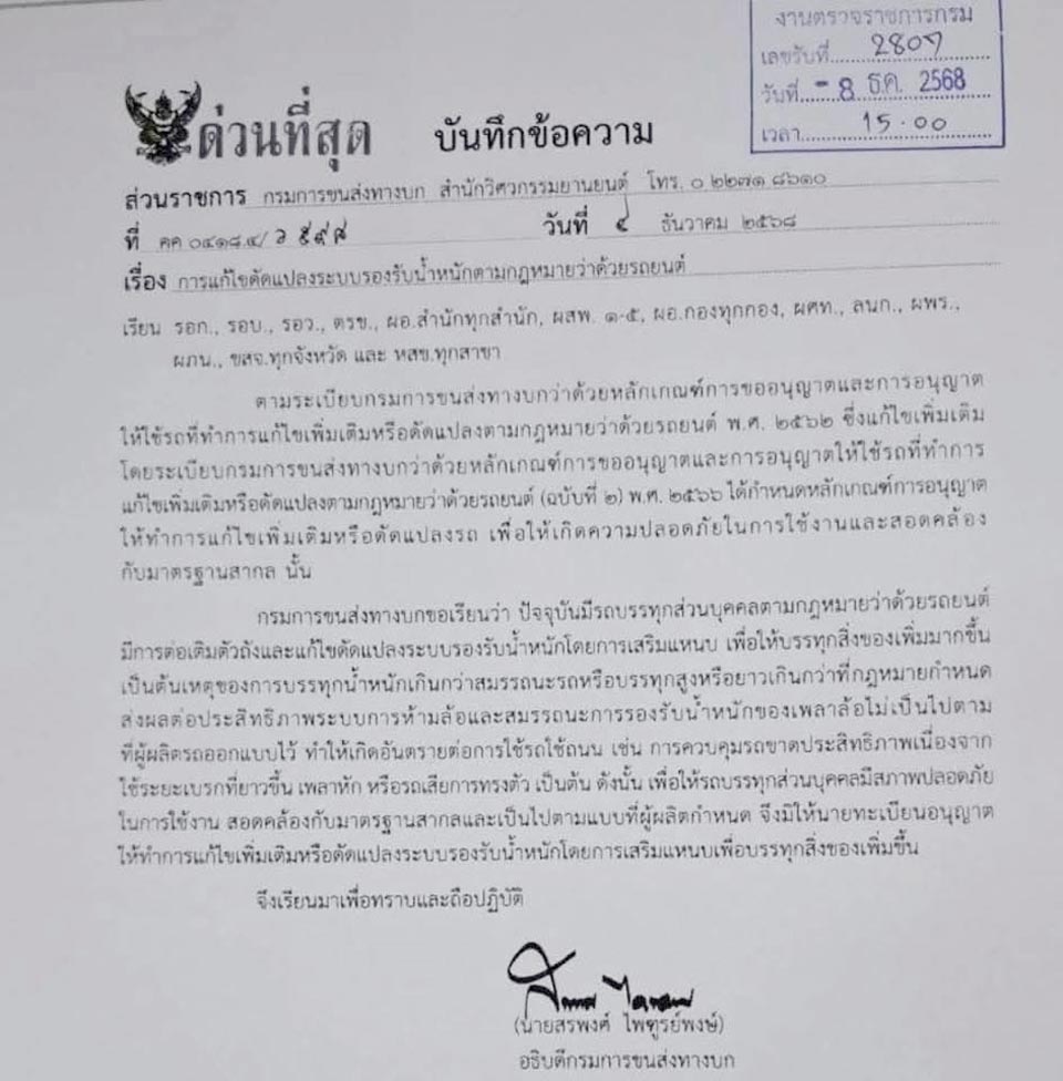 ตามที่กรมการขนส่งทางบกได้มีหนังสือ ด่วนที่สุด ที่ คค ๔๑๘./๕๙๘ ลงวันที่ ๔ ธันวาคม ๒๕๖๘ กำหนดเกี่ยวกับการแก้ไขตัดแปลงระบบรองรับนำหนักตามกฎหมายว่าด้วยรถยนต์โดยมีให้นายทะเบียนอนุญาตให้ทำการแก้ไขเพิ่มเติม หรือตัดแปลงระบบรองรับน้ำหนัก (เสริมแหนบ) เพื่อบรรทุกสิ่งของเพิ่มขึ้นนั้น