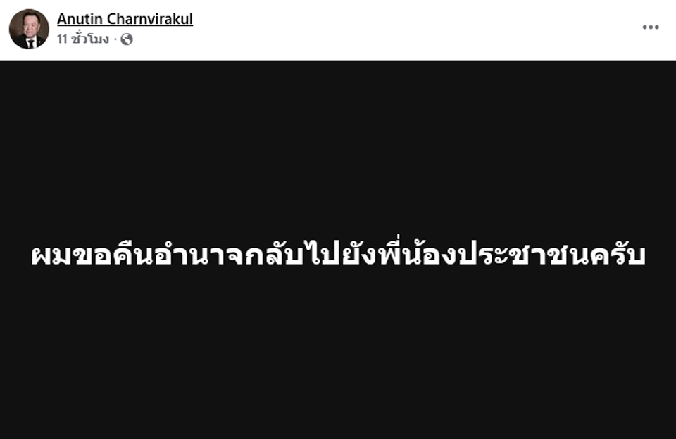 ทั้งนี้ เพจ Anutin Charnvirakul โพสต์ระบุว่า.. “ผมขอคืนอำนาจกลับไปยังพี่น้องประชาชนครับ”