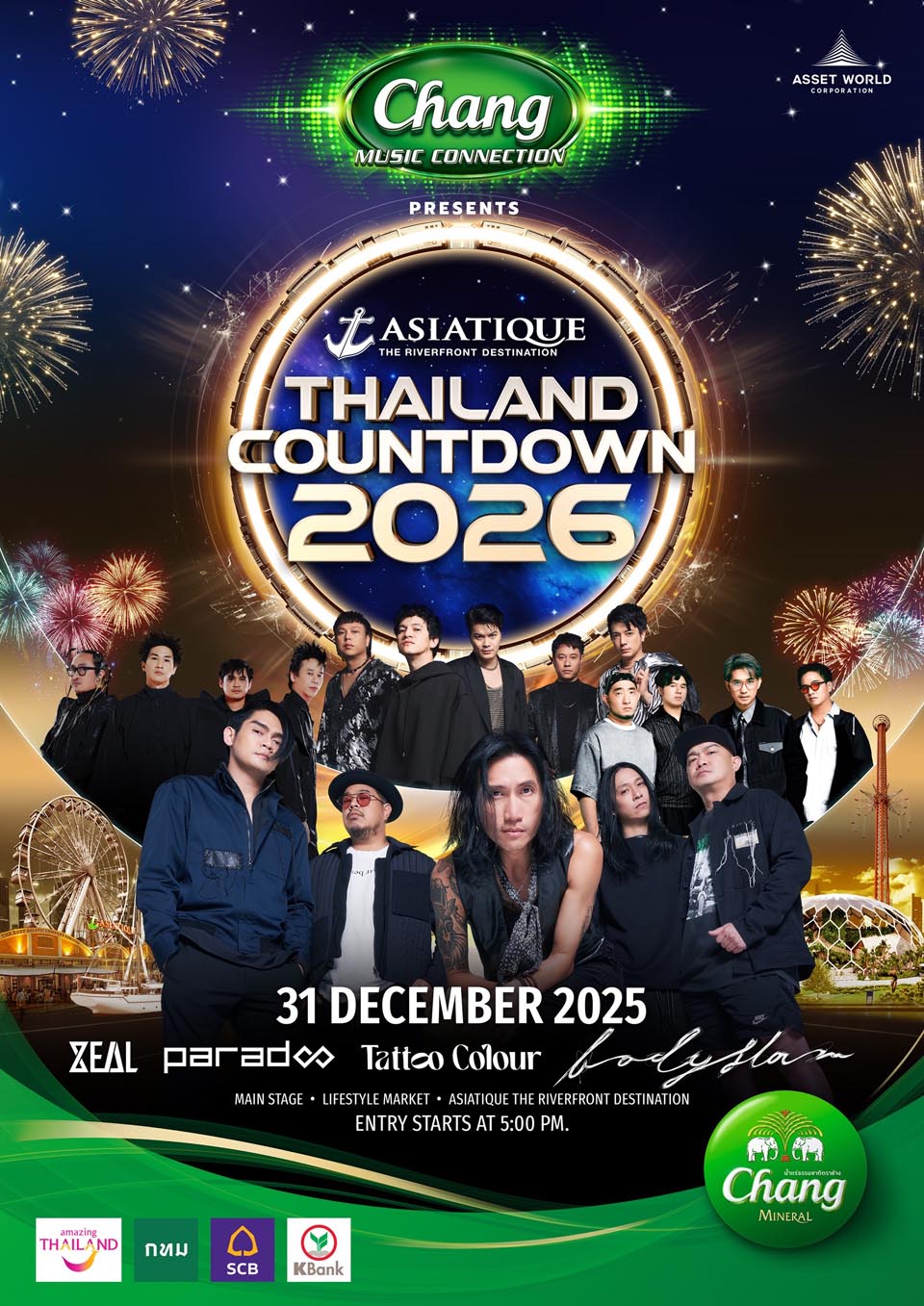 ‘CHANG MUSIC CONNECTION presents ASIATIQUE’s THAILAND COUNTDOWN 2026’ จัดเต็มลาน Lifestyle Market ริมน้ำเจ้าพระยา กับคอนเสิร์ตเต็มรูปแบบจากศิลปินระดับท็อปของประเทศ ได้แก่ ZEAL, PARADOX, TATTOO COLOUR, BODYSLAM ตื่นตากับ Mega Visual Stage, Laser Show, Interactive Countdown Screen พร้อมพลุสุดอลังการออกแบบโดยทีมระดับโลก และปิดท้ายด้วย After Party จากดีเจชื่อดัง ที่จะทำให้ค่ำคืนส่งท้ายปีเก่าต้อนรับปีใหม่กลายเป็นคืนที่สมบูรณ์แบบที่สุด รับชมถ่ายทอดสดทั่วประเทศผ่านทาง Amarin TV ช่อง 34
