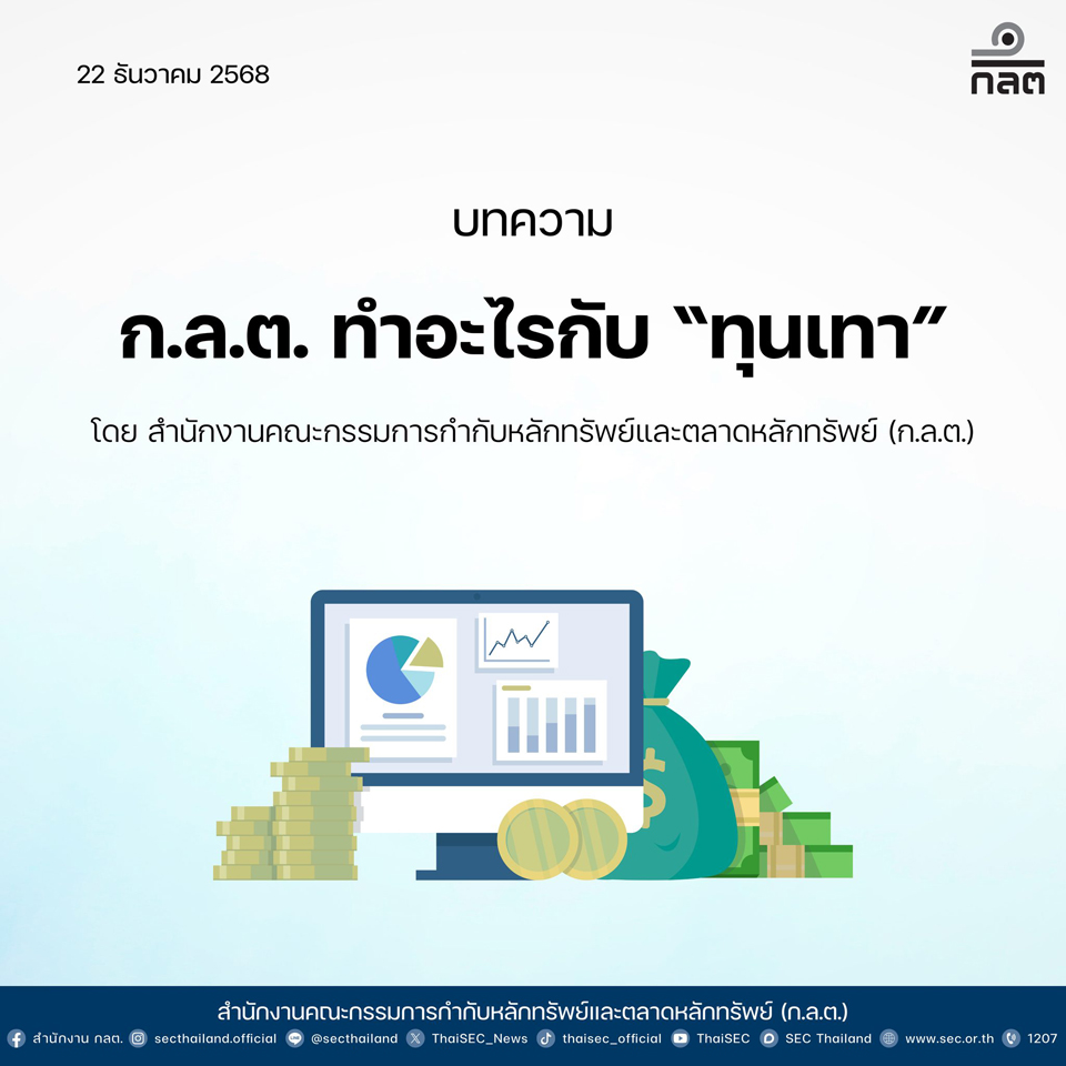ท้ายที่สุดนี้ ก.ล.ต. อยากให้ความมั่นใจว่า ปัญหาทุนเทาที่เกิดขึ้นถึงแม้บั่นทอนความเชื่อมั่นในบางจุด แต่การเห็นปัญหาและมีความร่วมมือแก้ไขภายใต้การมีธรรมภิบาลของทุกภาคส่วนที่เกี่ยวข้อง ตลาดทุนไทยจึงไม่ได้เทาแบบที่กังวล และข้อเท็จจริงคือตลาดทุนไทยยังคงเป็นกลไกสำคัญของการระดมทุนและการออมที่สนับสนุนการเติบโตทางเศรษฐกิจของประเทศ โดย ก.ล.ต. ยังคงเดินหน้าเต็มกำลังในการดูแลตลาดทุน เพื่อให้คุณมั่นใจ