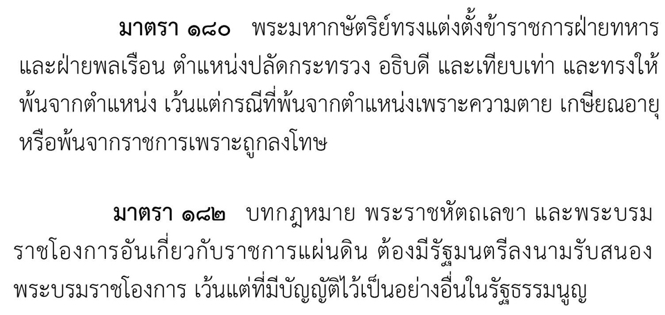 โดยรัฐธรรมนูญแห่งราชอาณาจักรไทย พ.ศ.2560 มาตรา 180 และมาตรา 182 บัญญัติไว้ว่า ตำแหน่งที่พระมหากษัตริย์ทรงโปรดเกล้าฯ แต่งตั้งและให้พ้นจากตำแหน่งนั้น การวินิจฉัยสถานะไม่ใช่อำนาจของบุคคลใดบุคคลหนึ่ง และไม่ใช่อำนาจของฝ่ายบริหาร แต่เป็นพระราชอำนาจโดยตรง