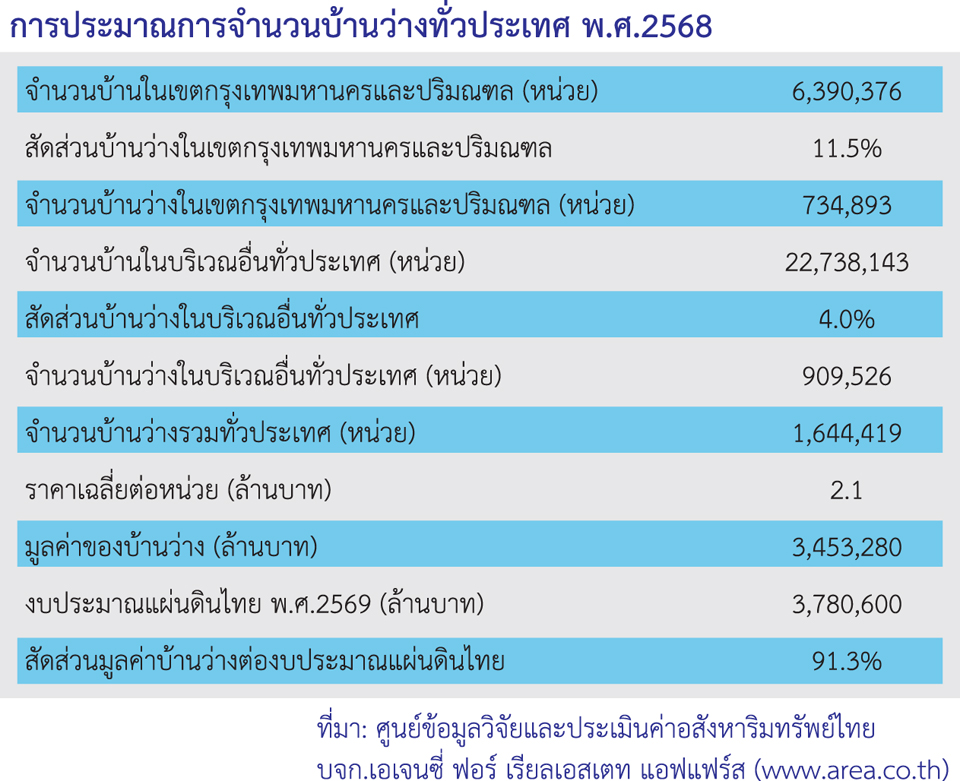 โดยศูนย์ข้อมูลวิจัยและประเมินค่าอสังหาริมทรัพย์ไทย ได้สำรวจบ้านว่างหรือที่อยู่อาศัยที่สร้างเสร็จแต่ไม่มีผู้เข้าอยู่อาศัยตั้งแต่ปี 2538 และในปี 2541 พบบ้านว่างประมาณ 350,000 หน่วย และบ้านว่างก็เพิ่มปริมาณขึ้นอย่างต่อเนื่อง ล่าสุดจากจำนวนบ้านในเขตกรุงเทพมหานครและปริมณฑลที่มีอยู่ 6,390,376 หน่วย ประมาณว่าเป็นบ้านว่าง 734,893 หน่วย ส่วนจำนวนบ้านในบริเวณอื่นทั่วประเทศ มี 22,738,143 หน่วย คาดว่า มีสัดส่วนบ้านว่างในบริเวณอื่นทั่วประเทศ 4.0% ดังนั้นจำนวนบ้านว่างในบริเวณอื่นทั่วประเทศจึงควรเป็น 909,526 หน่วย รวมทั่วประเทศก็คือ 1,644,419 หน่วย หากประมาณการว่าราคาเฉลี่ยต่อหน่วยคือ 2.1 ล้านบาท ทำให้มูลค่าของบ้านว่างเป็นเงินถึง 3,453,280 ล้านบาท ซึ่งเกือบเท่า (หรือ 91.3%) ของงบประมาณแผ่นดิน พ.ศ.2569 (3,780,600 ล้านบาท)