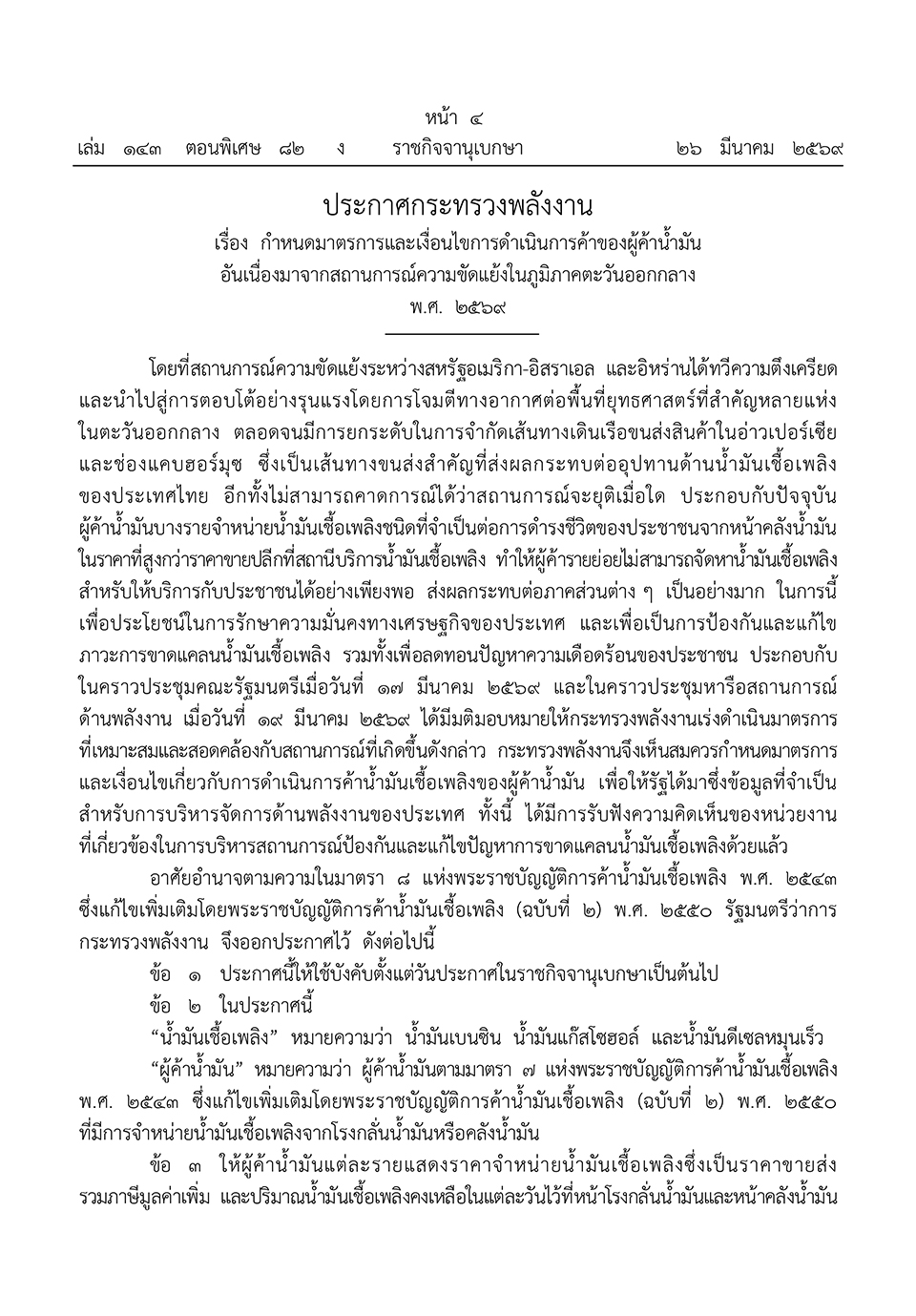 ผู้สื่อข่าวรายงานว่า เมื่อวันที่ 26 มีนาคม 2569 ราชกิจจานุเบกษา เผยแพร่ประกาศของ กระทรวงพลังงาน เรื่อง “กำหนดมาตรการและเงื่อนไขการดำเนินการค้าของผู้ค้าน้ำมัน อันเนื่องมาจากสถานการณ์ความขัดแย้งในภูมิภาคตะวันออกกลาง พ.ศ.2569”