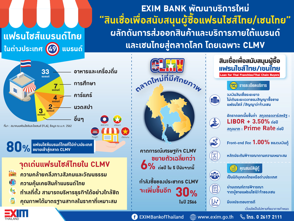 ประมาณว่า... EXIM BANK ผนึกกำลังร่วมกับ กรมพัฒนาธุรกิจการค้า กระทรวงพาณิชย์ และภาคเอกชน ผู้เป็นเจ้าของแฟรนไชส์แบรนด์ไทย พร้อมจะให้การส่งเสริมและสนับสนุนผู้ประกอบการนิติบุคคลในกลุ่มประเทศ CMLV ทั้งที่เป็นบริษัทคนไทยและคนท้องถิ่น สามารถจะขอกู้เงินเพื่อนำไปซื้อแฟรนไชส์แบรนด์ไทย ซึ่งปัจจุบันมี 49 แบรนด์ที่รุกเข้าดำเนินธุรกิจในกลุ่มประเทศเหล่านี้ จากทั้งหมดที่มีกว่า 584 แบรนด์ และกว่า 1 แสนสาขาทั่วประเทศ