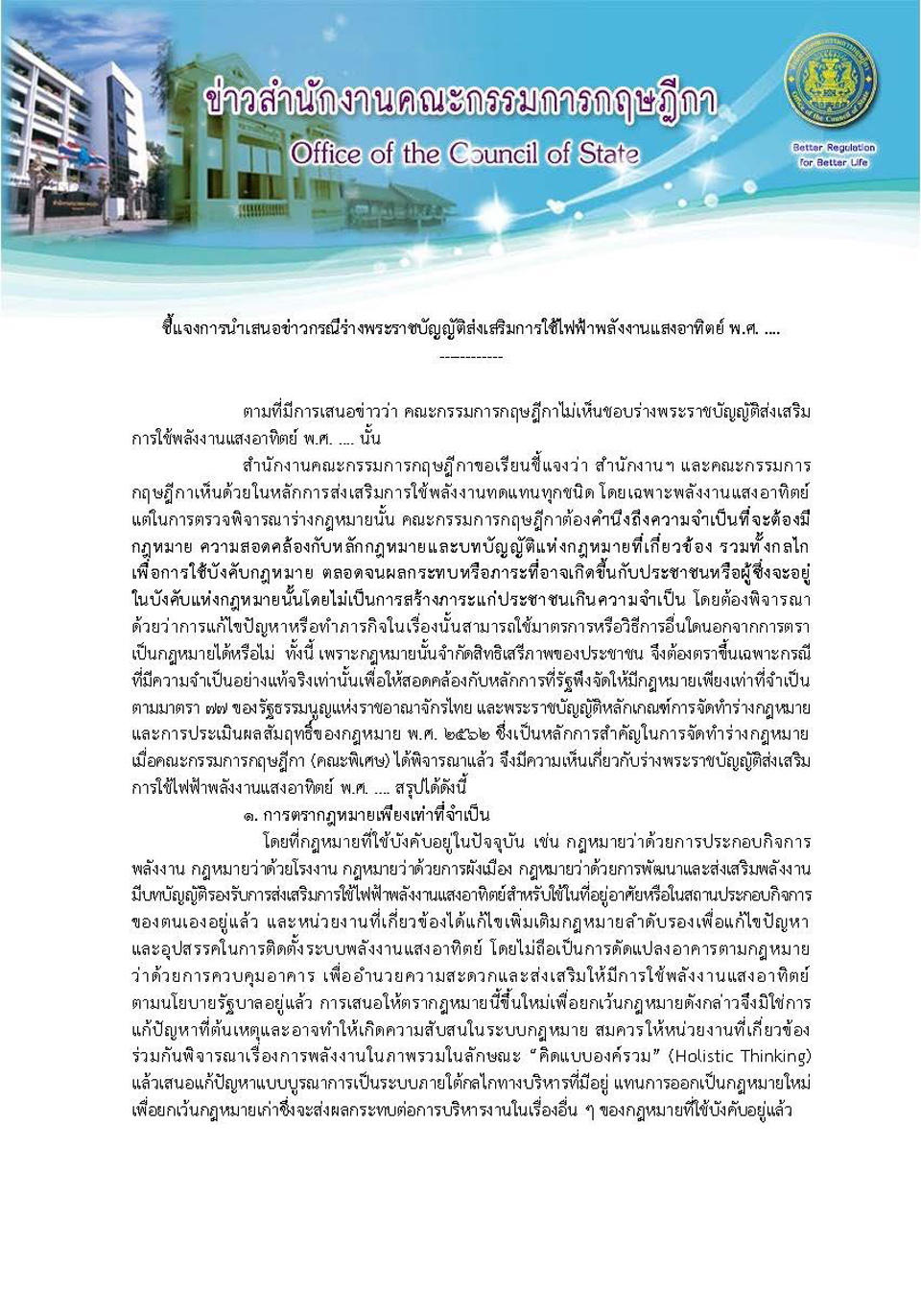 ตามที่มีการเสนอข่าวว่า คณะกรรมการกฤษฎีกาไม่เห็นชอบร่างพระราชบัญญัติส่งเสริมการใช้พลังงานแสงอาทิตย์ พ.ศ. .... นั้น