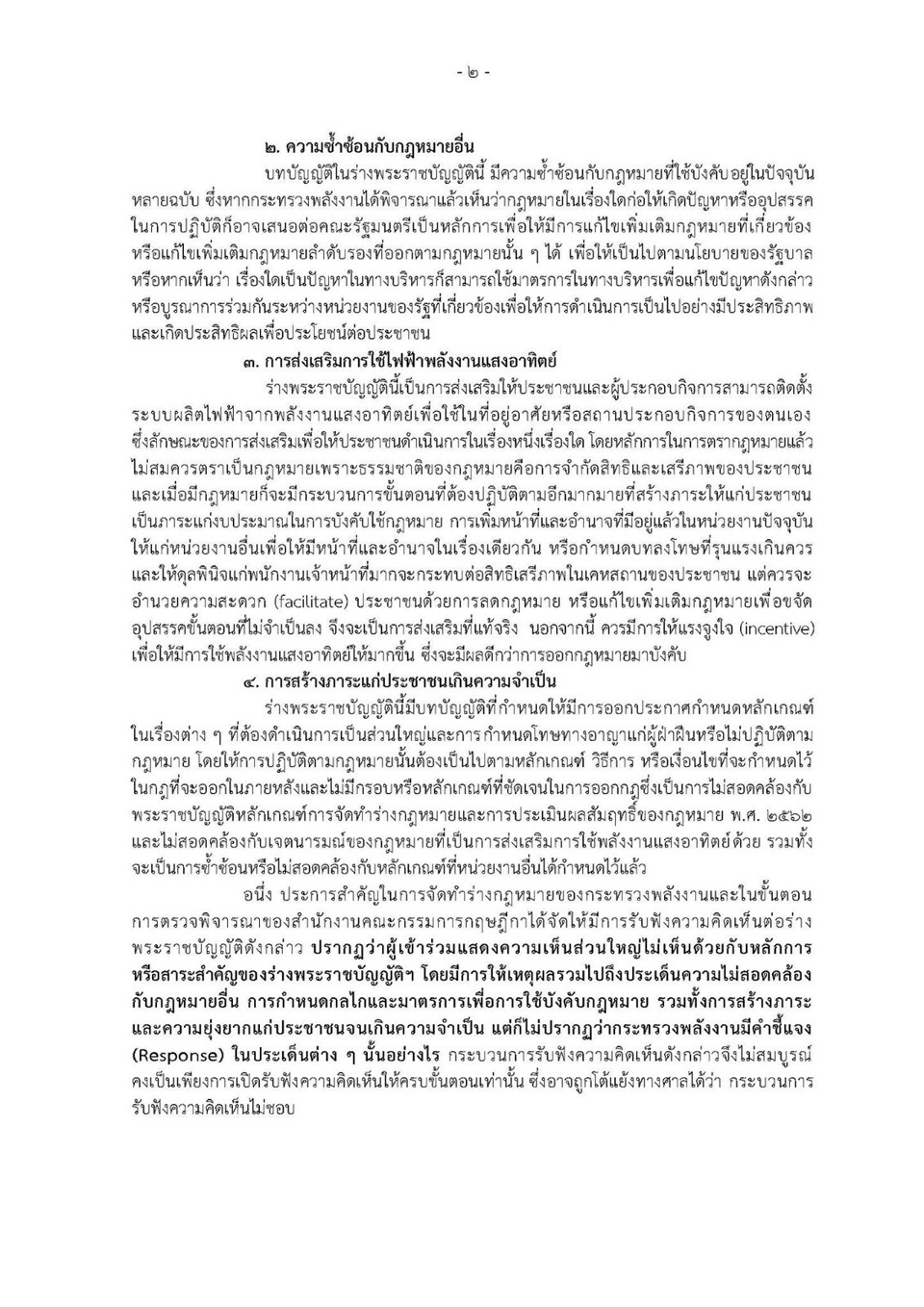 ร่างพระราชบัญญัตินี้มีบทบัญญัติที่กำหนดให้มีการออกประกาศกำหนดหลักเกณฑ์ในเรื่องต่าง ๆ ที่ต้องดำเนินการเป็นส่วนใหญ่และการกำหนดโทษทางอาญาแก่ผู้ฝ่าฝืนหรือไม่ปฏิบัติตามกฎหมาย โดยให้การปฏิบัติตามกฎหมายนั้นต้องเป็นไปตามหลักเกณฑ์ วิธีการ หรือเงื่อนไขที่จะกำหนดไว้ในกฎที่จะออกในภายหลังและไม่มีกรอบหรือหลักเกณฑ์ที่ชัดเจนในการออกกฎซึ่งเป็นการไม่สอดคล้องกับพระราชบัญญัติหลักเกณฑ์การจัดทำร่างกฎหมายและการประเมินผลสัมฤทธิ์ของกฎหมาย พ.ศ. ๒๕๖๒ และไม่สอดคล้องกับเจตนารมณ์ของกฎหมายที่เป็นการส่งเสริมการใช้พลังงานแสงอาทิตย์ด้วย รวมทั้งจะเป็นการซ้ำซ้อนหรือไม่สอดคล้องกับหลักเกณฑ์ที่หน่วยงานอื่นได้กำหนดไว้แล้ว