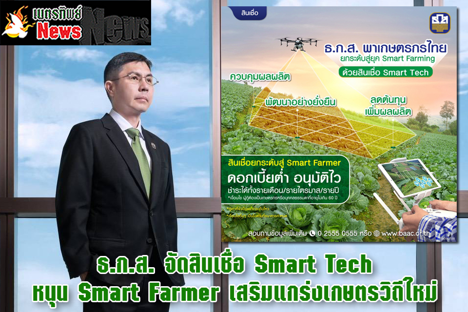 ธ.ก.ส. เปิดตัว “สินเชื่อเพื่อเทคโนโลยีและเครื่องจักรกลการเกษตร (Smart Tech)” กรอบวงเงินรวม 1.5 หมื่นล้านบาท เพื่อเป็นค่าใช้จ่ายหรือการลงทุนในการนำเทคโนโลยีและนวัตกรรมการเกษตรมาช่วยลดต้นทุนและเพิ่มศักยภาพการผลิต พร้อมเดินหน้าหนุนเกษตรกรไทยปรับเปลี่ยนการผลิตจากเกษตรดั้งเดิมสู่การเป็น Smart Farmer ยกระดับการบริหารจัดการฟาร์มอย่างยั่งยืน ดอกเบี้ย MRR - 1 หรือร้อยละ 5.625 ต่อปี วันนี้ ที่ ธ.ก.ส. ทุกสาขาทั่วประเทศ