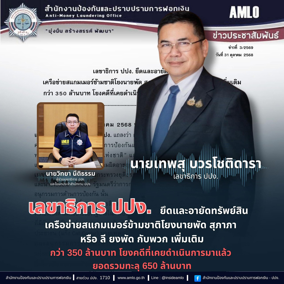 ด่วน! เลขาธิการ ปปง. ยึดและอายัดทรัพย์สิน เครือข่ายสแกมเมอร์ข้ามชาติโยงนายพัด สุภาภา หรือ ลี ยงพัด กับพวก เพิ่มเติมกว่า 350 ล้านบาท โยงคดีที่เคยดำเนินการมาแล้ว ยอดรวมทะลุ 650 ล้านบาท