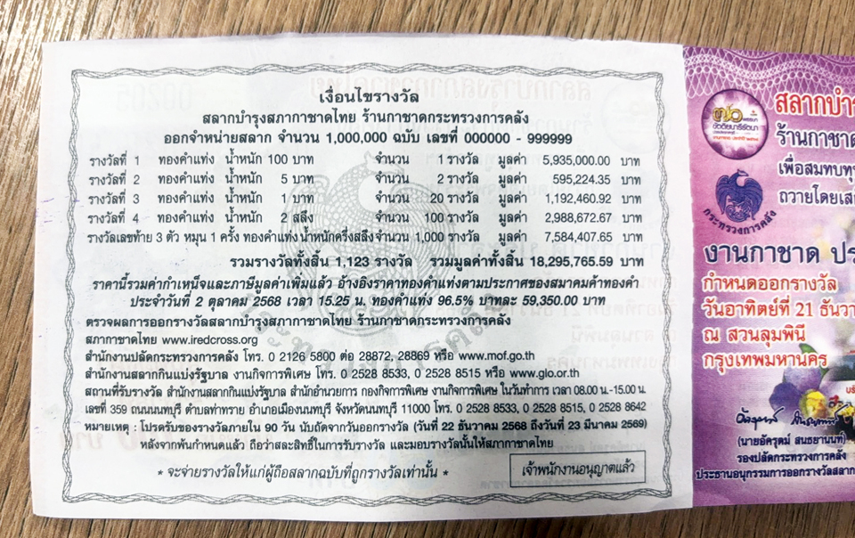 ทั้งนี้ กระทรวงการคลังได้มีการออกสลากกาชาด 2568 โดยจะเริ่มจำหน่ายในวันพุธที่ 5 พฤศจิกายน 2568 ในราคาฉบับละ 50.- บาท โดยผู้โชคดีนอกเหนือจากจะได้ร่วมทำบุญให้กับสภากาชาดไทย ผ่านกระทรวงการคลังแล้ว ยังได้ลุ้นรับรางวัลทองคำ มูลค่ากว่า 17.5 ล้านบาท (คิดตามราคาทองคำ ณ วันที่ 24 กันยายน 2568) โดย