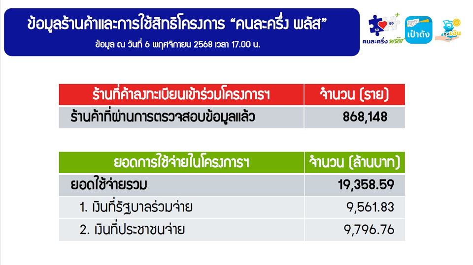 นายวินิจ วิเศษสุวรรณภูมิ ผู้อำนวยการสำนักงานเศรษฐกิจการคลัง ในฐานะโฆษกกระทรวงการคลัง เปิดเผยความคืบหน้าการใช้สิทธิโครงการคนละครึ่ง พลัส (โครงการฯ) โดย ณ วันที่ 6 พฤศจิกายน 2568 เวลา 17.00 น. มีผู้ใช้จ่ายผ่านโครงการฯ สำเร็จแล้วกว่า 18.91 ล้านราย ยอดใช้จ่ายรวมกว่า 19,358.60 ล้านบาท โดยแบ่งเป็นเงินที่ประชาชนจ่ายจำนวน 9,796.76 ล้านบาท และเงินที่รัฐร่วมจ่ายจำนวน 9,561.84 ล้านบาท ทั้งนี้ ประชาชนสามารถใช้จ่ายกับร้านค้าที่เข้าร่วมโครงการฯ ได้จนถึงวันที่ 31 ธันวาคม 2568 ระหว่างเวลา 06.00 - 23.00 น. ผ่าน G-Wallet ในแอปพลิเคชัน “เป๋าตัง” โดยในแต่ละวันไม่จำเป็นต้องใช้จ่ายให้เต็มสิทธิ 200 บาท สำหรับความคืบหน้าของการลงทะเบียนร้านค้าในโครงการฯ จากข้อมูลสะสม ณ วันที่ 6 พฤศจิกายน 2568 เวลา 17.00 น. มีร้านค้าที่ผ่านการตรวจสอบข้อมูลแล้วจำนวน 868,148 ราย
