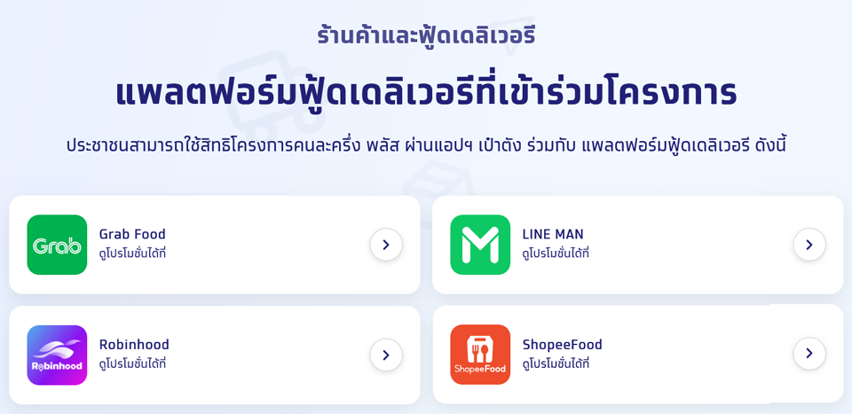 โฆษกกระทรวงการคลัง กล่าวเพิ่มเติมว่า พรุ่งนี้ (วันที่ 7 พฤศจิกายน 2568) จะเป็นวันแรกที่ประชาชนสามารถใช้จ่ายกับร้านอาหารและเครื่องดื่มที่เข้าร่วมโครงการฯ ผ่านผู้ให้บริการระบบขนส่งอาหาร (Food Delivery Platform) 4 แพลตฟอร์ม ได้แก่ Grab Lineman Robinhood และ ShopeeFood โดยต้องเริ่มการใช้สิทธิผ่านแอปพลิเคชัน “เป๋าตัง” ก่อนจะเชื่อมโยงไปยัง Food Delivery Platform ที่ต้องการได้ต่อไป ทั้งนี้ สามารถสั่งอาหารและเครื่องดื่มได้ระหว่างเวลา 06.00 - 21.00 น. จนถึงวันที่ 31 ธันวาคม 2568