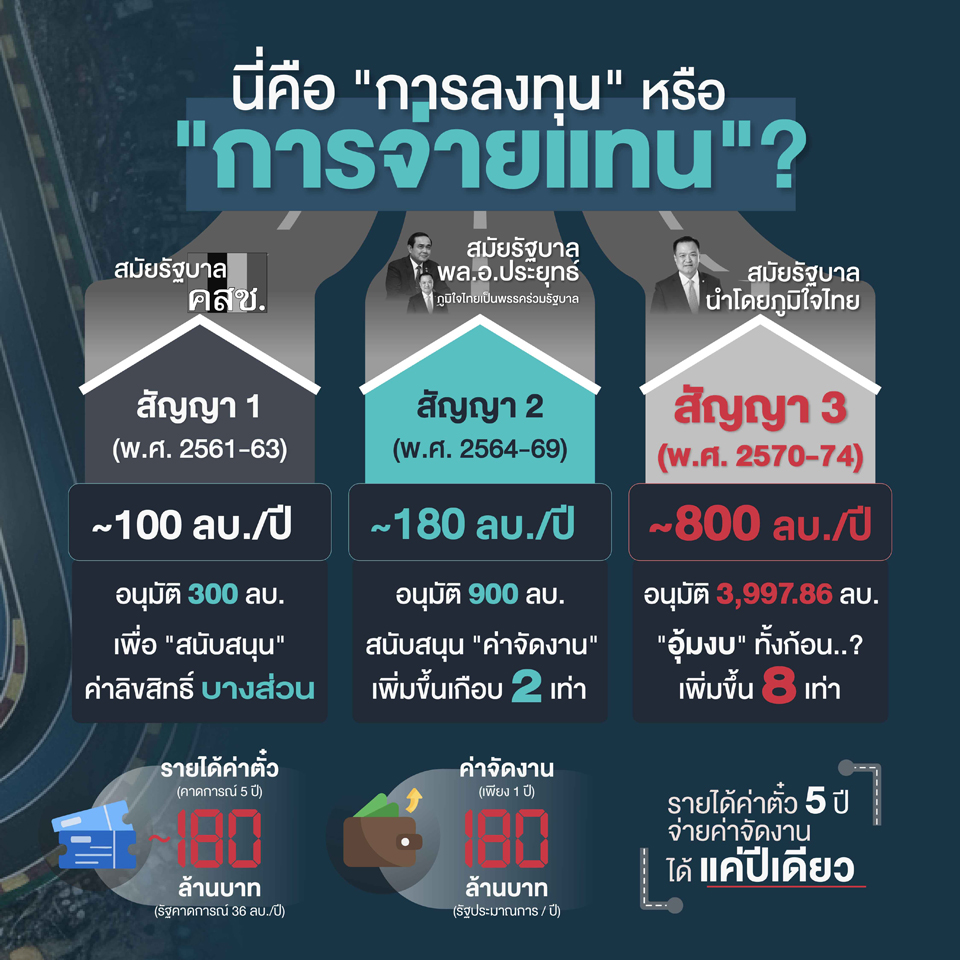 การที่ภาระงบประมาณของรัฐพุ่งสูงขึ้นถึง 8 เท่า สะท้อนว่าโมเดลนี้อาจไม่ยั่งยืนในเชิงธุรกิจ และขาดความคุ้มค่า จนภาคเอกชนอาจไม่ร่วมลงทุน และรัฐต้องเข้ามา "จ่ายแทน” ข้อมูลในภาพตอกย้ำประเด็นนี้ชัดเจนว่า "รายได้ค่าตั๋ว" ที่รัฐคาดการณ์ตลอด 5 ปี (ประมาณ 180 ล้าน) เพิ่งจะเท่ากับ "ค่าจัดงาน" เพียงปีเดียว (180 ล้าน)