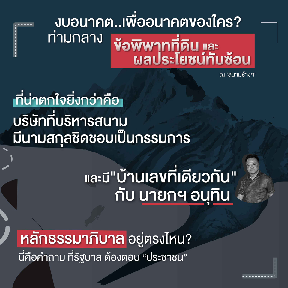 การกระทำนี้คือการ "ดึงงบในอนาคตมาใช้" เพื่อสนับสนุนธุรกิจที่เชื่อมโยงกับผู้มีอำนาจในปัจจุบันภายใต้ชื่อ "ส่งเสริมการท่องเที่ยว" แต่ผลประโยชน์อาจไหลกลับเข้ากระเป๋าเอกชนกลุ่มเดิมอย่างชัดเจน แม้กระทั่งที่ดินโดยรอบสนามบางส่วนยังเป็นของ การรถไฟแห่งประเทศไทย ประมาณ 5 พันไร่
