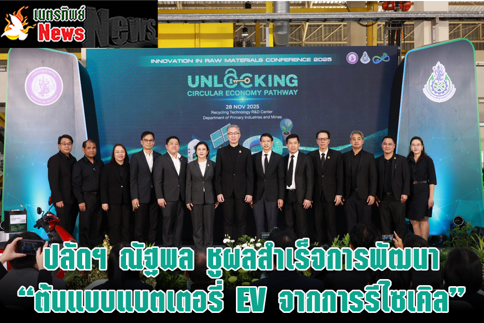 นายณัฐพล รังสิตพล ปลัดกระทรวงอุตสาหกรรม เป็นประธานในพิธีเปิดงานสัมมนาวิชาการ Innovation in Raw Materials Conference 2025 ในหัวข้อ “Unlocking Circular Economy Pathway ปลดล็อกเส้นทางสู่เศรษฐกิจหมุนเวียน” จัดโดยกรมอุตสาหกรรมพื้นฐานและการเหมืองแร่ (กพร.) ณ ศูนย์วิจัยและพัฒนาเทคโนโลยีรีไซเคิล อำเภอพระประแดง จังหวัดสมุทรปราการ เพื่อผลักดันนวัตกรรมและเทคโนโลยีสู่การผลิตวัตถุดิบ (ทดแทน/ขั้นสูง) ในเชิงพาณิชย์ ส่งเสริมให้ผู้ประกอบการมีความรู้ ความเข้าใจ และสามารถนำหลักการเศรษฐกิจหมุนเวียน (Circular Economy) ไปประยุกต์ใช้เพื่อพัฒนาองค์กรควบคู่กับความยั่งยืน พร้อมถ่ายทอดความสำเร็จของนวัตกรรมและเทคโนโลยีวัตถุดิบทดแทนและวัตถุดิบขั้นสูง เดินหน้าเสริมสร้างศักยภาพผู้ประกอบการไทยด้วยเศรษฐกิจหมุนเวียน มุ่งสู่สังคมคาร์บอนต่ำ โดยภายในงานมีการเปิดตัว “ต้นแบบแบตเตอรี่ EV จากการรีไซเคิล” ที่พัฒนาได้สำเร็จเป็นครั้งแรก