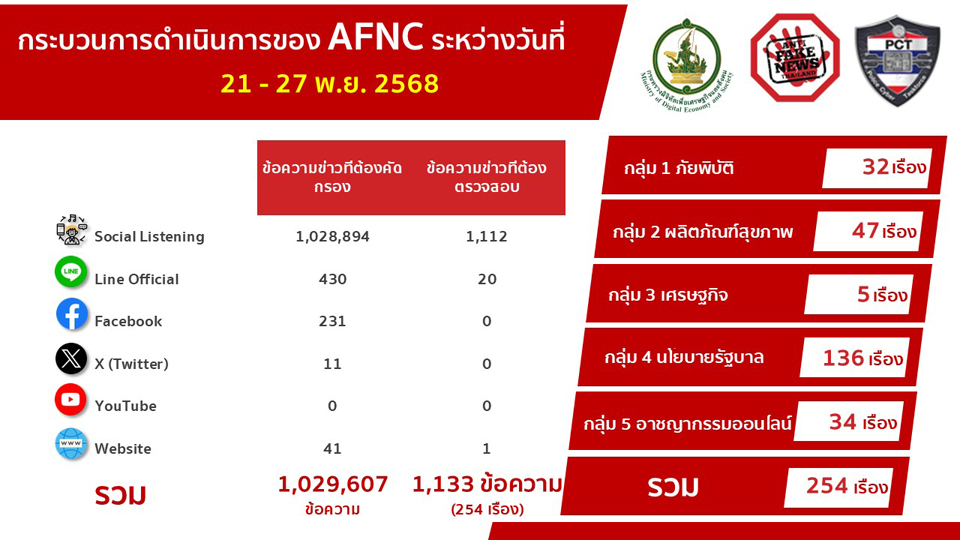ทั้งนี้ในระหว่างวันที่ 21 – 27 พฤศจิกายน 2568 พบข้อความที่เข้ามาทั้งหมด 1,029,607 ข้อความ โดยมีข้อความที่ต้องดำเนินการตรวจสอบ (Verify) ทั้งสิ้น 1,133 ข้อความ สำหรับช่องทางที่มีการพบเบาะแสมากที่สุด คือ ข้อความที่มาจาก Social Listening จำนวน 1,112 ข้อความ ตามมาด้วยการแจ้งเบาะแสผ่าน Line Official จำนวน 20 ข้อความ และช่องทาง Website จำนวน 1 ข้อความ รวมเรื่องที่ต้องดำเนินการตรวจสอบทั้งหมด 254 เรื่อง และจากการประสานงานกับหน่วยงานที่เกี่ยวข้อง ได้รับผลการตรวจสอบกลับมาแล้ว 90 เรื่อง