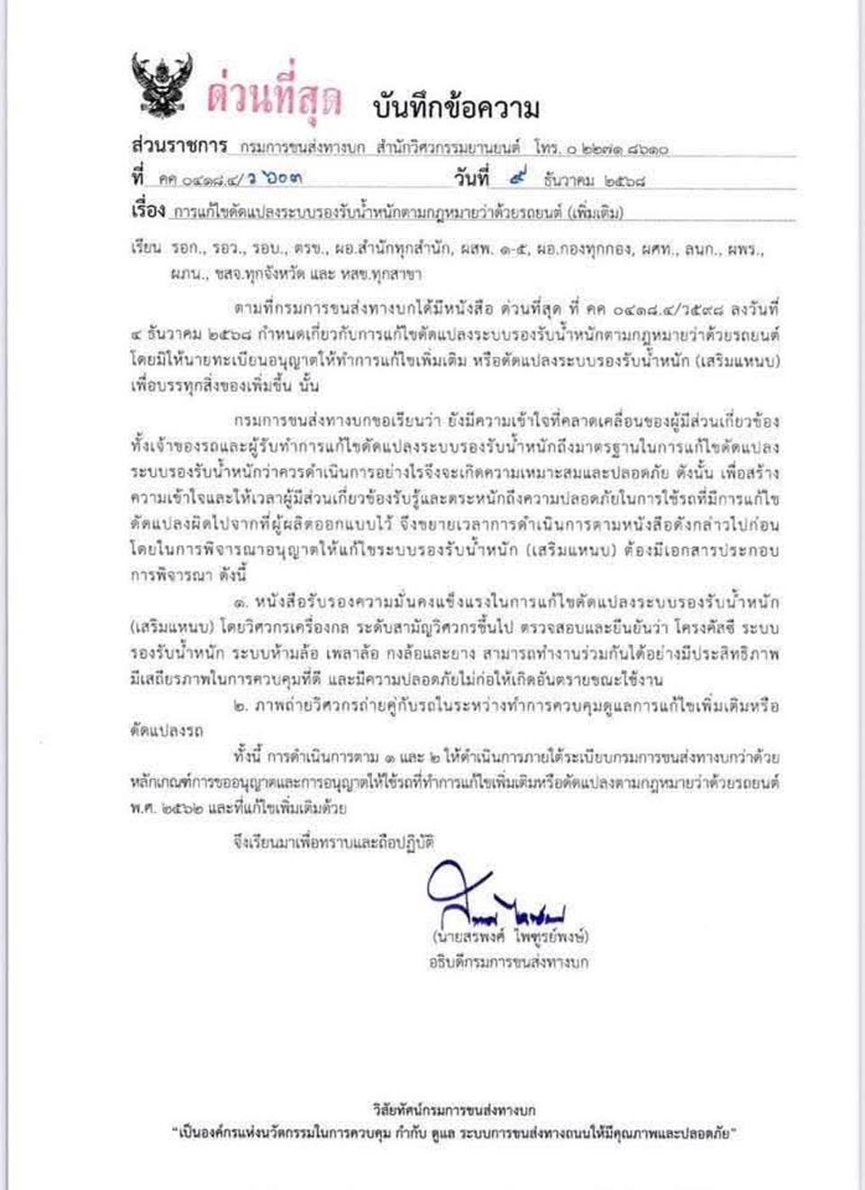 ตามที่กรมการขนส่งทางบกได้มีหนังสือ ด่วนที่สุด ที่ คค ๔๑๘./๕๙๘ ลงวันที่ ๔ ธันวาคม ๒๕๖๘ กำหนดเกี่ยวกับการแก้ไขตัดแปลงระบบรองรับนำหนักตามกฎหมายว่าด้วยรถยนต์โดยมีให้นายทะเบียนอนุญาตให้ทำการแก้ไขเพิ่มเติม หรือตัดแปลงระบบรองรับน้ำหนัก (เสริมแหนบ) เพื่อบรรทุกสิ่งของเพิ่มขึ้นนั้น
