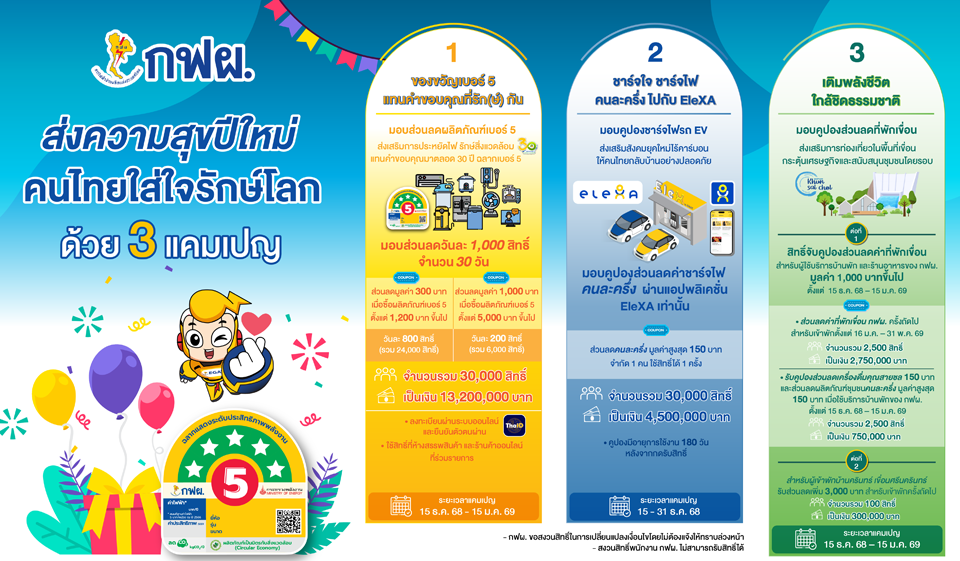 • ของขวัญเบอร์ 5 แทนคำขอบคุณที่รัก(ษ์)กัน มอบส่วนลดผลิตภัณฑ์เบอร์ 5 วันละ 1,000 สิทธิ์ รวม 30,000 สิทธิ์ แบ่งเป็น ส่วนลด 300 บาท เมื่อซื้อผลิตภัณฑ์เบอร์ 5 ตั้งแต่ 1,200 บาทขึ้นไป วันละ 800 สิทธิ์ และส่วนลด 1,000 บาท เมื่อซื้อผลิตภัณฑ์เบอร์ 5 ตั้งแต่ 5,000 บาทขึ้นไป วันละ 200 สิทธิ์ โดยต้องลงทะเบียนรับส่วนลดทางเว็บไซต์ กฟผ. และยืนยันตัวตนผ่าน Thai ID และใช้สิทธิ์ซื้อสินค้า ณ ห้างสรรพสินค้าและร้านค้าออนไลน์ที่ร่วมรายการภายใน 48 ชั่วโมง ทั้งนี้สามารถใช้สิทธิ์ได้ตั้งแต่วันที่ 15 ธันวาคม 2568 – 15 มกราคม 2569