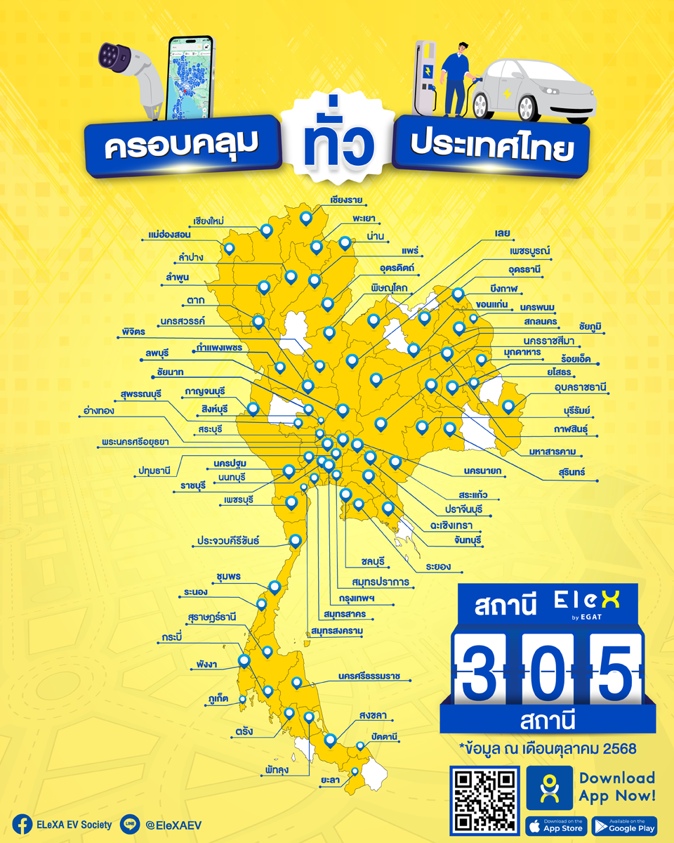 • ชาร์จใจ ชาร์จไฟ คนละครึ่งไปกับ EleXA ส่งเสริมสังคมยุคใหม่ไร้คาร์บอน ให้คนไทยกลับบ้านอย่างปลอดภัย โดยมอบคูปองส่วนลดค่าชาร์จรถยนต์ไฟฟ้าคนละครึ่งที่สถานี EleX by EGAT ทุกสถานีทั่วประเทศ มูลค่าสูงสุด 150 บาท (จำกัด 1คน/ 1 สิทธิ์) รวม 30,000 สิทธิ์ สามารถกดรับสิทธิ์ผ่านแอปพลิเคชัน EleXA ตั้งแต่วันที่ 15 – 31 ธันวาคม 2568 โดยคูปองมีอายุ 180 วัน หลังจากกดรับสิทธิ์