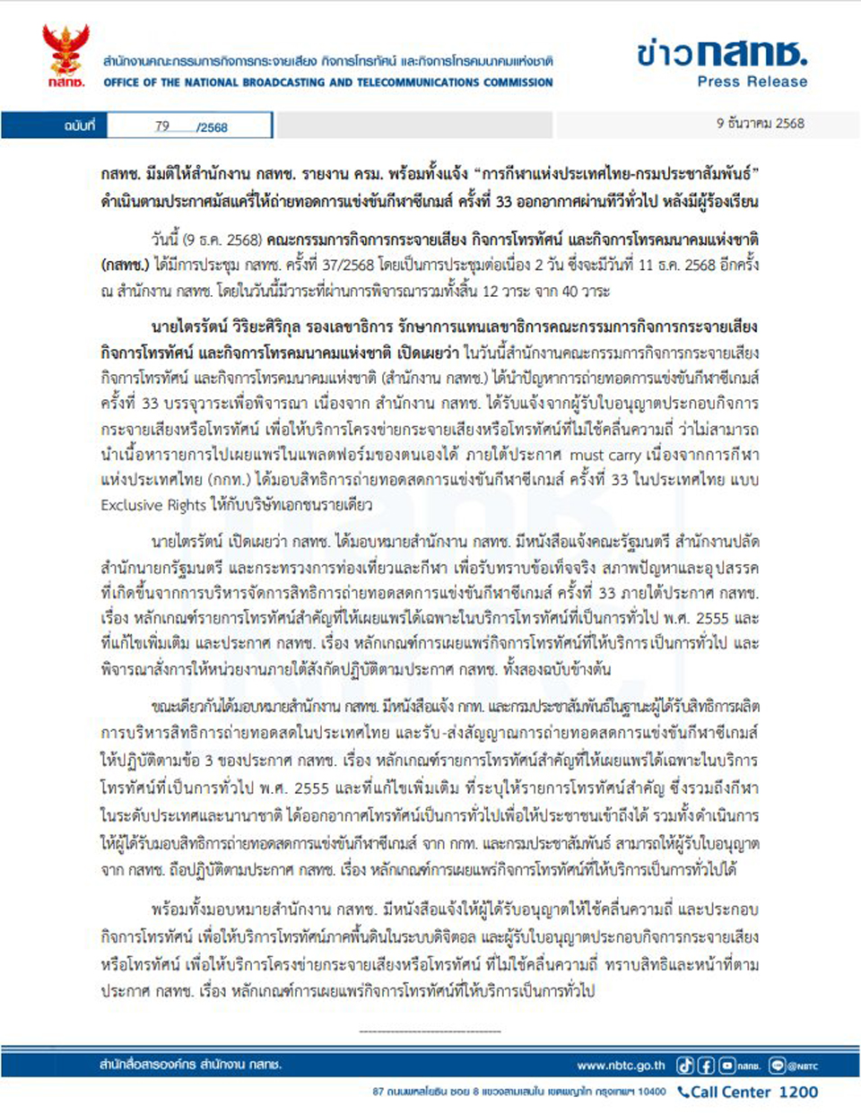 แม้ที่ประชุมคณะกรรมการกิจการกระจายเสียง กิจการโทรทัศน์ และกิจการโทรคมนาคมแห่งชาติ หรือ กสทช. จะมีการประชุม และมีมติไปตั้งแต่วันที่ 9 ธันวาคม 2568 มอบหมายให้ สำนักงาน กสทช. มีหนังสือแจ้งคณะรัฐมนตรี (ครม.) สำนักงานปลัดสำนักนายกรัฐมนตรี และกระทรวงการท่องเที่ยวและกีฬา เพื่อรับทราบข้อเท็จจริง สภาพปัญหาและอุปสรรคที่เกิดขึ้นจากการบริหารจัดการสิทธิการถ่ายทอดสดการแข่งขันกีฬาซีเกมส์ ครั้งที่ 33 ภายใต้ประกาศ กสทช. เรื่องหลักเกณฑ์รายการโทรทัศน์สำคัญที่ให้เผยแพร่ได้เฉพาะในบริการโทรทัศน์ที่เป็นการทั่วไป พ.ศ.2555 และที่แก้ไขเพิ่มเติม และประกาศ กสทช. เรื่อง หลักเกณฑ์การเผยแพร่กิจการโทรทัศน์ที่ให้บริการเป็นการทั่วไป