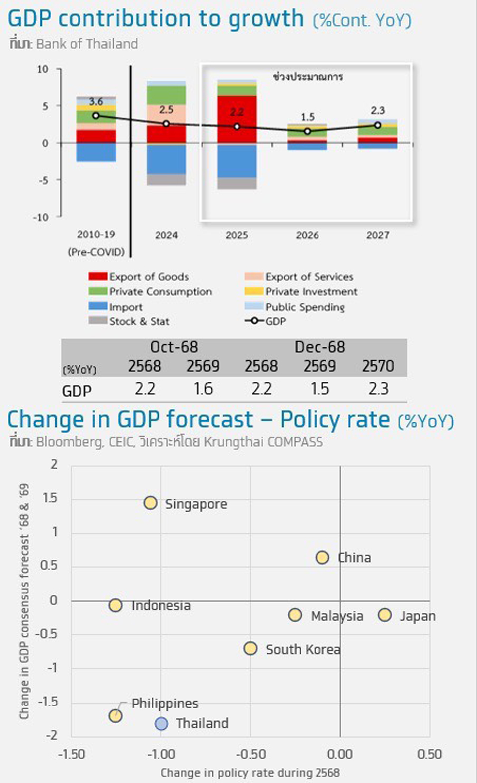 Krungthai COMPASS คาดว่าในปีหน้ายังมีโอกาสที่ กนง. จะปรับลดอัตราดอกเบี้ย แม้ policy space มีจำกัด จากความเสี่ยงต่อเศรษฐกิจที่สูงขึ้น ประกอบกับการส่งสัญญาณ policy coordination กับมาตรการภาครัฐ อาจส่งผลให้ กนง. ดำเนินนโยบายเชิงรุก (proactive) มากขึ้น