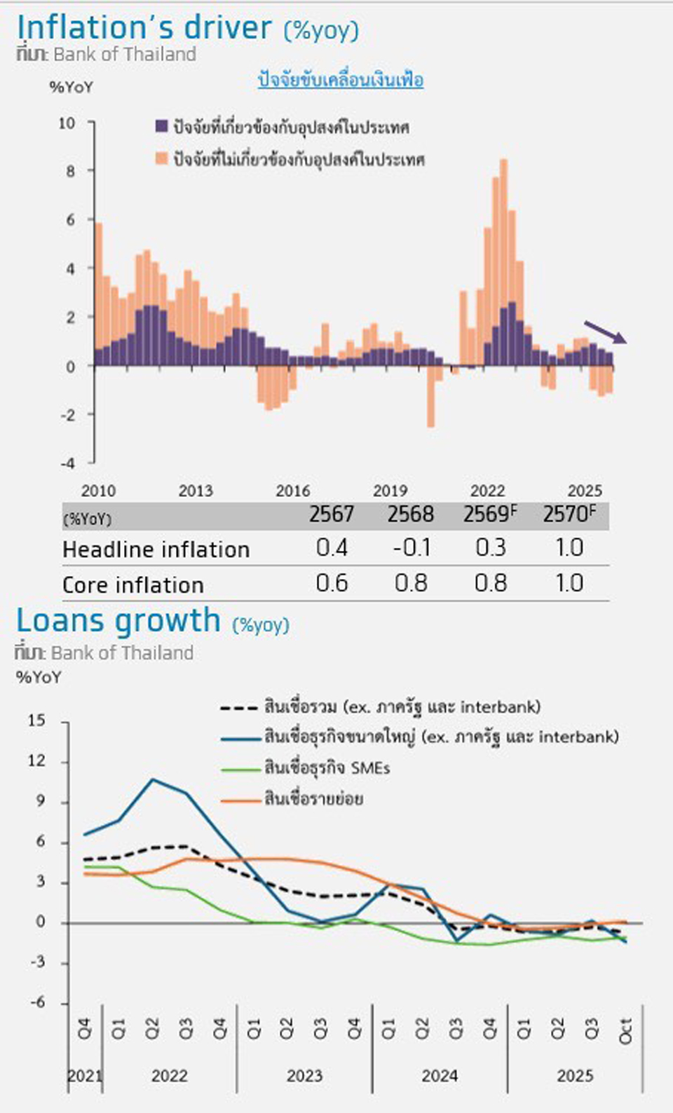 เศรษฐกิจไทยมีแนวโน้มการเติบโตที่ชะลอตัวอย่างชัดเจน และมีความเสี่ยงที่มากขึ้น โดย กนง. คาดว่าเศรษฐกิจจะขยายตัวชะลอลงจากการบริโภคที่แผ่วลงตามแนวโน้มรายได้ที่ขยายตัวต่ำ โดยเฉพาะในภาคการผลิต และผลกระทบของ US tariff ที่จะทยอยเพิ่มขึ้น อีกทั้งผลของสถานการณ์อุทกภัยในพื้นที่ภาคใต้ที่ส่งผลกระทบต่อกิจกรรมทางเศรษฐกิจ โดยเฉพาะในภาคบริการ ซึ่งผลกระทบนี้คาดว่าจะต่อเนื่องไปจนถึงไตรมาสแรกของปี 2569 โดยรวมทำให้เกิดความเสี่ยงเพิ่มเติมต่อ SMEs และครัวเรือนในกลุ่มเปราะบาง ขณะที่แนวโน้มการท่องเที่ยวคาดว่าจะทยอยฟื้นตัวอย่างช้าๆ