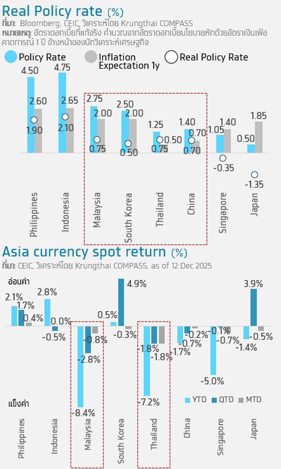 โดยอัตราดอกเบี้ยที่แท้จริงที่ กนง. ชี้ว่าอยู่ในระดับผ่อนคลาย Krungthai COMPASS คาดว่าในปีหน้าอาจสามารถผ่อนคลายเพิ่มเติมอย่างน้อย 0.25% หากโมเมนตัมเศรษฐกิจอ่อนแอกว่าที่ประเมิน จากทั้งข้อตกลงทางการค้ากับสหรัฐที่ยังไม่ได้ข้อสรุป และการเบิกจ่ายที่อาจล่าช้า ซึ่งจะกระทบรายได้เพิ่มเติม นอกจากนี้ GDP ปี 2569 และ 2570 ที่ กนง. คาดว่าจะขยายตัวที่ 1.5% และ 2.3% ตามลำดับ ทำให้เฉลี่ย 5 ปี กนง. มองว่าเศรษฐกิจไทยขยายตัวได้เพียง 2.1% ต่ำกว่าช่วง 5 ปีก่อนโควิดที่ขยายตัวได้เฉลี่ยที่ 3.4% เอื้อให้นโยบายการเงินสนับสนุนได้เพิ่มเติม อีกทั้งเมื่อเปรียบเทียบกับภูมิภาคอัตราดอกเบี้ยที่แท้จริงของไทยยังอยู่ในระดับใกล้เคียงกับมาเลเซีย เกาหลีใต้ และจีน