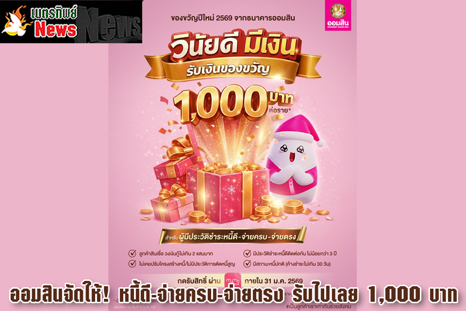 ผู้สื่อข่าวรายงานว่า ธนาคารออมสิน ร่วมส่งมอบความสุขในช่วงเทศกาลต้อนรับปีใหม่ 2569 จัดเตรียมของขวัญ เพื่อส่งความสุขให้ประชาชน ภายใต้โครงการ “วินัยดี มีเงิน” ให้แก่ลูกค้าธนาคาร ด้วยการมอบเงินของขวัญพิเศษรายละ 1,000 บาท ให้แก่ลูกหนี้ที่ใช้บริการสินเชื่อวงเงินกู้ไม่เกิน 200,000 บาท มีประวัติชำระหนี้ดีติดต่อกันไม่น้อยกว่า 3 ปี ไม่เคยปรับโครงสร้างหนี้/ไม่มีประวัติการตัดหนี้สูญ และมีสถานะหนี้ปกติ (ค้างชำระไม่เกิน 30 วัน) ทั้งนี้ ธนาคารจะโอนเงินเข้าบัญชีภายในเดือนกุมภาพันธ์ 2569 เฉพาะผู้ที่มีบัญชีเงินฝากเผื่อเรียกที่เป็นชื่อตนเอง (ยกเว้นบัญชีเพื่อประโยชน์ของผู้เยาว์ และบัญชีร่วม) ที่กดรับสิทธิ์ผ่านแอปพลิเคชัน MyMo ภายในวันที่ 31 มกราคม 2569 และเงื่อนไขเป็นไปตามที่ธนาคารกำหนด เพื่อมอบเป็นขวัญและกำลังใจแก่ลูกค้าที่มีวินัยในการผ่อนชำระหนี้ที่ดี นำไปใช้เป็นเงินทุนเสริมสภาพคล่องในการประกอบอาชีพ หรือใช้จ่ายในช่วงเทศกาลปีใหม่