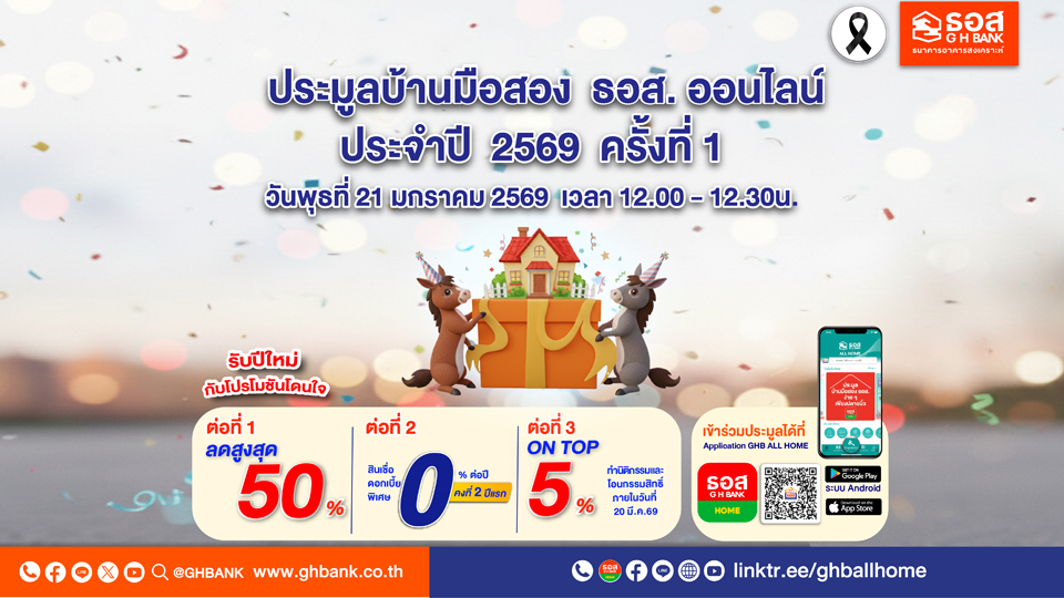 ธนาคารอาคารสงเคราะห์ (ธอส.) จัดงานประมูลบ้านมือสอง ธอส. ออนไลน์ ประจำปี 2569 ครั้งที่ 1 ต้อนรับปีม้าอย่างยิ่งใหญ่ นำทรัพย์คุณภาพดี ทำเลเด่น ราคาโดนใจ กว่า 1,600 รายการ ทั่วประเทศ ออกจำหน่ายลดราคาสูงสุดกว่า 50% จากราคาปกติ พร้อม ON TOP เพิ่มอีก 5% หากทำนิติกรรมและโอนกรรมสิทธิ์ภายในเวลาที่กำหนด และโปรโมชันสินเชื่อดอกเบี้ยพิเศษคงที่ 2 ปีแรก 0% ต่อปี พบกันในวันพุธที่ 21 มกราคม 2569 นี้ ผ่าน Application : GHB ALL HOME