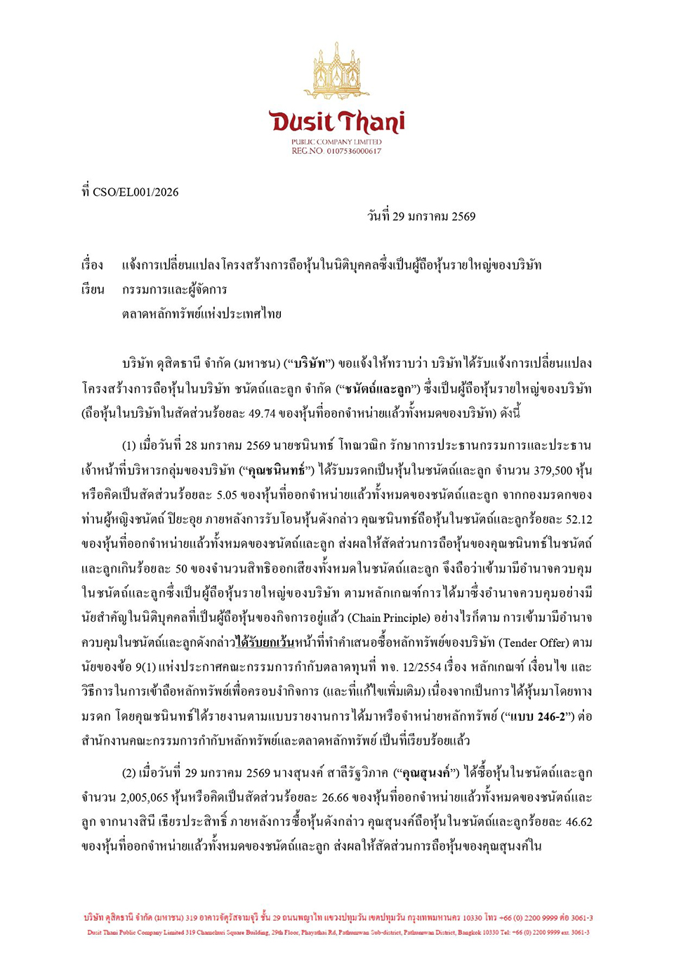ผู้สื่อข่าวรายงานว่า เมื่อวันที่ 29 มกราคม บริษัท ดุสิตธานี จำกัด (มหาชน) ทำหนังสือแจ้งตลาดหลักทรัพย์แห่งประเทศไทย (ตลท.) เรื่องการเปลี่ยนแปลงโครงสร้างการถือหุ้นใน บริษัท ชนัตถ์และลูก จำกัด ซึ่งเป็นบริษัทโฮลดิ้งที่ถือหุ้นใหญ่ใน DUSIT (สัดส่วน 49.74%) โดยมีใจความสำคัญ ดังนี้..