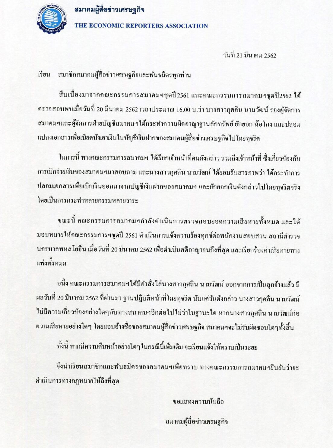 โดยระบุใจความว่า คณะกรรมการสมาคมฯ ชุดปี 2561-2562 ได้ตรวจพบเมื่อวันที่ 20 มีนาคม 2562 ว่า นางสาวกุศลิน นามวัฒน์ ตำแหน่งรองผู้จัดการสมาคมฯ และผู้จัดการฝ่ายบัญชีสมาคมฯ ได้กระทำผิดอาญาฐานลักทรัพย์ ยักยอก ฉ้อโกง และปลอมแปลงเอกสาร เพื่อเบียดบังเอาเงินในบัญชีเงินฝากของสมาคมฯ ไปโดยทุจริต