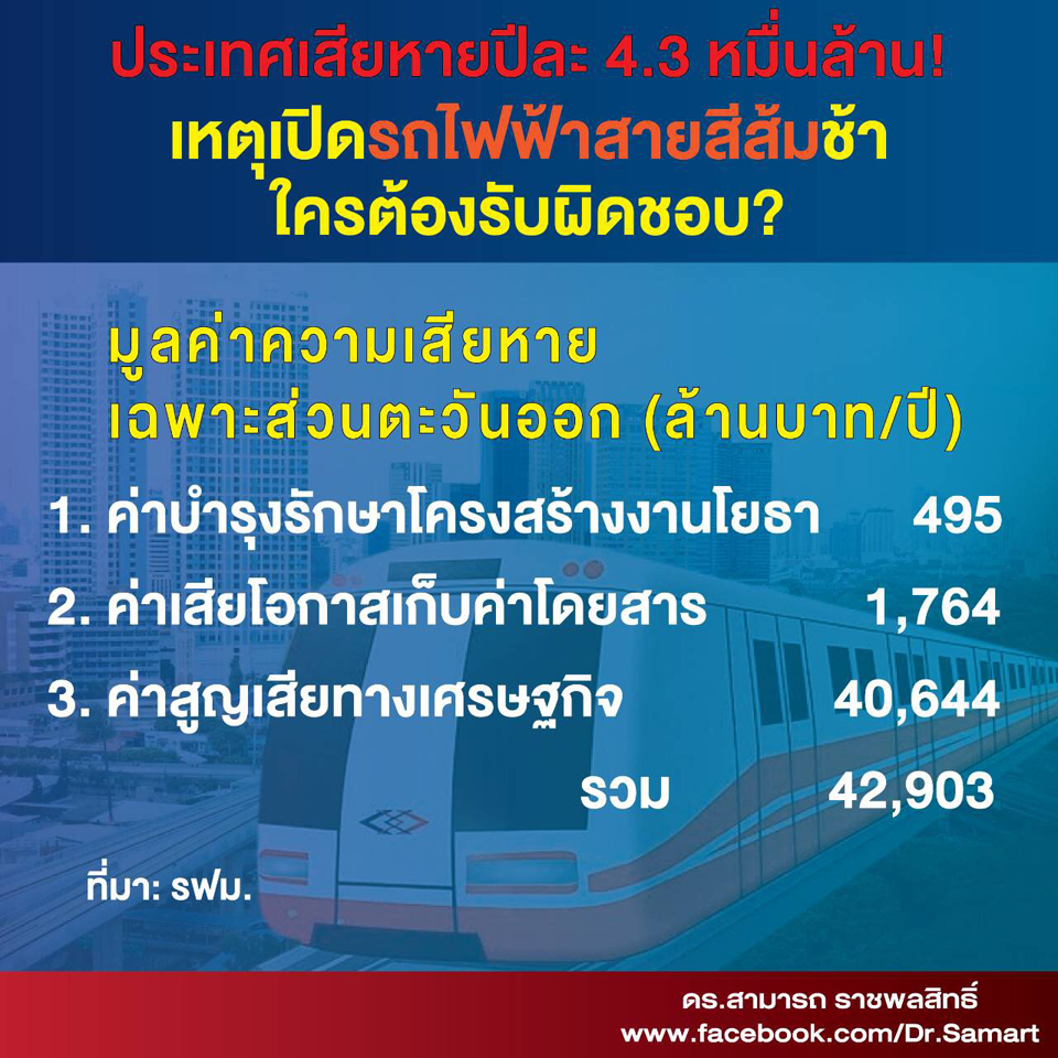 รฟม. ได้ประเมินความเสียหายที่เกิดขึ้น กรณีเปิดให้บริการรถไฟฟ้าสายสีส้มส่วนตะวันออกล่าช้า พบว่า ประเทศจะเสียหายสูงถึง 4.3 หมื่นล้านบาท/ปี ประกอบด้วย