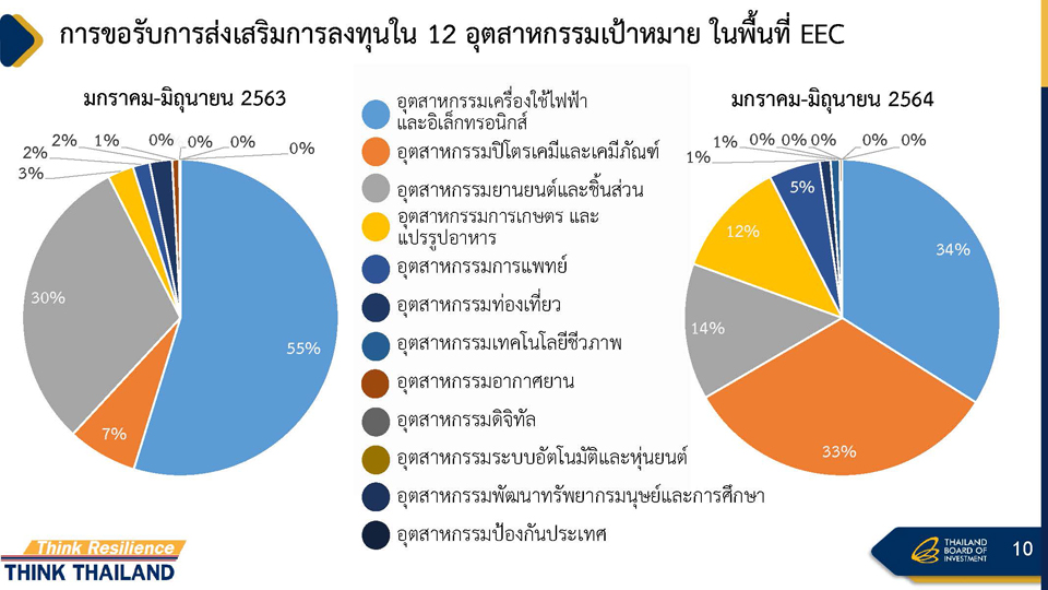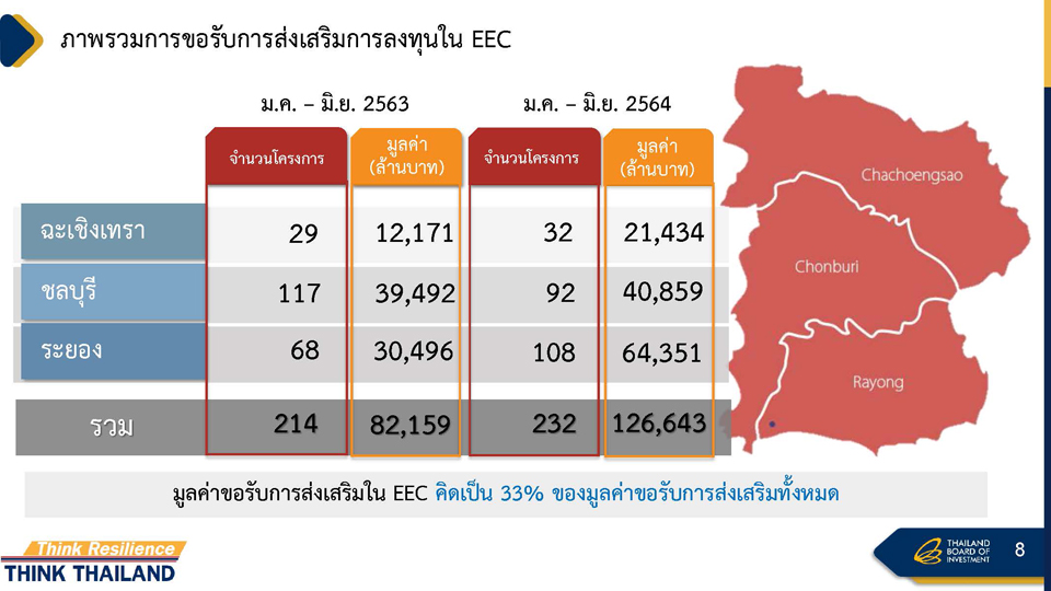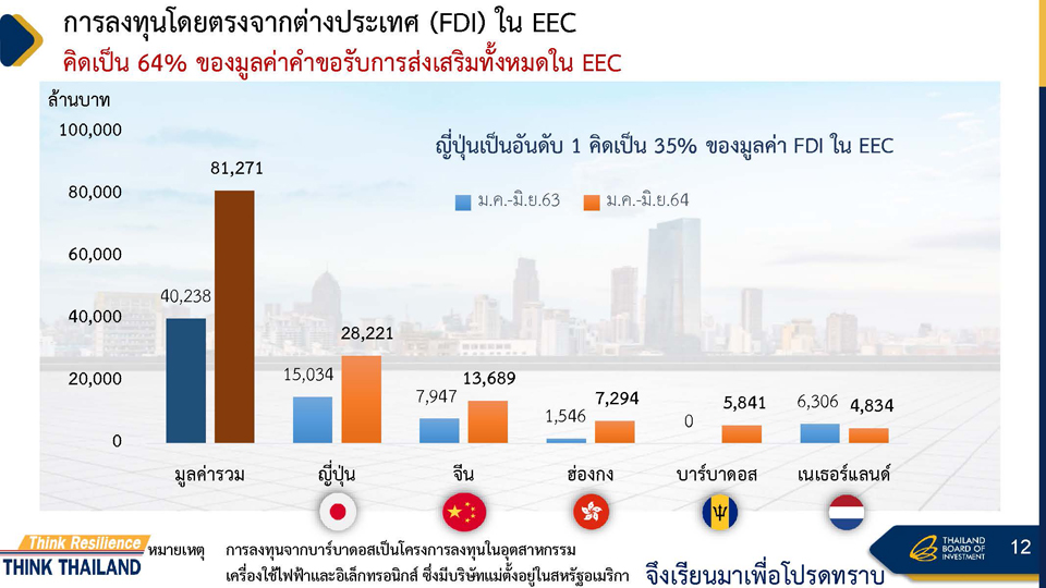 สำหรับการลงทุนช่วง 6 เดือนที่ผ่าน (ม.ค.-มิ.ย. 64) มีการขอรับส่งเสริมลงทุน 232 โครงการ เงินลงทุน 126,643 ล้านบาท เพิ่มขึ้นร้อยละ 53 (จากช่วงเดียวกันปี 63) การอนุมัติส่งเสริมลงทุน 195 โครงการ เงินลงทุน 74,250 ล้านบาท และออกบัตรส่งเสริม 187 โครงการ เงินลงทุน 88,083 ล้านบาท โดยจำนวนขอโครงการสูงสุด คือ อุตสาหกรรมยานยนต์-ชิ้นส่วน ส่วนเงินลงทุนสูงสุดคือ เครื่องใช้ไฟฟ้าอิเล็คทรอนิกส์ สำหรับการลงทุนตรงจากต่างประเทศ (FDI) คิดเป็นร้อยละ 64 ของคำขอลงทุนในอีอีซี ซึ่งนักลงทุนที่สนใจมากที่สุดคือ ญี่ปุ่น จีน ฮ่องกง ตามลำดับ