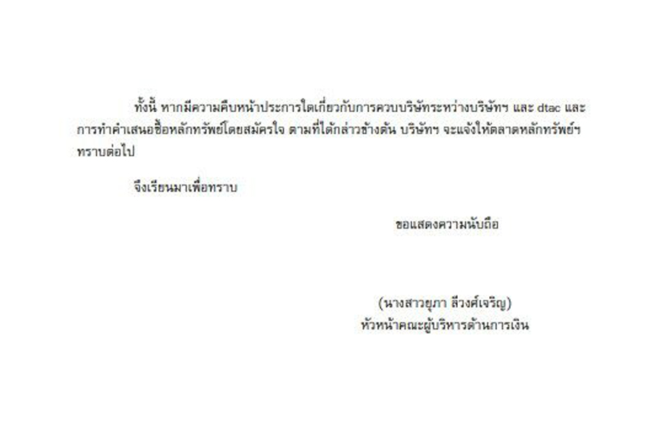 หันกลับมาพูดถึงประเด็นการควบรวมกิจการของกลุ่มทรูและดีแทค ที่ ดูเหมือนทั้ง นายศุภชัย เจียรวนนท์ ประธานคณะผู้บริหาร เครือเจริญโภคภัณฑ์ และประธานกรรมการ บริษัททรู คอร์ปอเรชั่น จำกัด (มหาชน) และ นายซิคเว่ เบรกเก้ ประธานและประธานเจ้าหน้าที่บริหาร กลุ่มเทเลนอร์ จะไม่พูดอะไรมากไปกว่า สิ่งที่ทั้ง 2 บริษัทได้แจ้งต่อตลาดหลักทรัพย์แห่งประเทศไทยไปก่อนหน้านี้