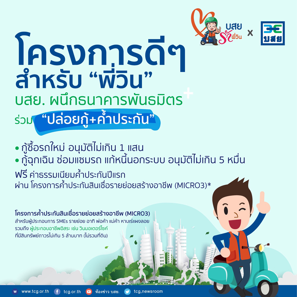 กระแสตอบรับพุ่ง คิกออฟโครงการ “บสย. รักพี่วิน” ตอบโจทย์ “เติมทุน” กลุ่มอาชีพอิสระ ซื้อรถใหม่ ซ่อมรถ กู้ฉุกเฉิน ปลดหนี้นอกระบบ ชูกลไกรัฐ “ค้ำประกันสินเชื่อ” นำร่องมอเตอร์ไซค์รับจ้าง ตั้งเป้า 10,000 ราย มั่นใจสร้างเงินหมุนเวียนในระบบเศรษฐกิจกว่า 4,580 ล้านบาท ลดปัญหาหนี้นอกระบบกว่า 100 ล้านบาท