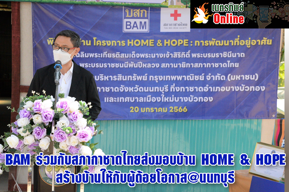 นายวีรเวช ศิริชาติไชย รองผู้จัดการใหญ่ สายสนับสนุนองค์กร นายจำรูญ กสิวัตร์ ผู้จัดการฝ่ายพัฒนาสินทรัพย์นนทบุรี และพนักงาน บริษัทบริหารสินทรัพย์ กรุงเทพพาณิชย์ จำกัด (มหาชน) หรือ BAM พร้อมด้วย นายไพโรจน์ จึงธนาเจริญ นายอำเภอบางบัวทอง นางกิ่งแก้ว จึงธนาเจริญ นายกกิ่งกาชาดอำเภอบางบัวทอง นายวีระชาติ เจริญนนทสิทธิ์ นายกเทศมนตรีเมืองใหม่บางบัวทอง และสมาชิกเทศบาลเมืองใหม่บางบัวทอง ร่วมส่งมอบบ้าน BAM “ โครงการ HOME & HOPE : การพัฒนาที่อยู่อาศัย เฉลิมพระเกียรติสมเด็จ พระนางเจ้าสิริกิติ์ พระบรมราชินีนาถ พระบรมราชชนนีพันปีหลวง สภานายิกาสภากาชาดไทย ” ให้แก่ นายสนิท ปานปิ่น ณ ตำบลบางบัวทอง อำเภอบางบัวทอง จังหวัดนนทบุรี เพื่อสนับสนุนให้เกิดการแก้ไขปัญหาที่อยู่อาศัย ด้วยการปลูกสร้างบ้านที่มั่นคงและปลอดภัยให้กับผู้ด้อยโอกาส ช่วยเหลือสังคมให้เกิดการพัฒนาอย่างยั่งยืนต่อไป