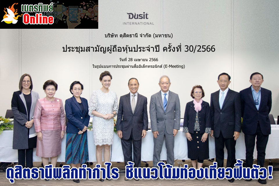 นายอาสา สารสิน ประธานกรรมการ นายชนินทธ์ โทณวณิก ประธานกรรมการบริหาร นางศุภจี สุธรรมพันธุ์ ประธานเจ้าหน้าที่บริหารกลุ่ม พร้อมด้วยคณะกรรมการ บริษัท ดุสิตธานี จำกัด (มหาชน) เข้าร่วมประชุมสามัญผู้ถือหุ้นประจำปี ครั้งที่ 30/2566 ในรูปแบบการประชุมผ่านสื่ออิเล็กทรอนิกส์ (E-Meeting) โดยที่ประชุมรับทราบผลประกอบการประจำปี 2565 ซึ่งธุรกิจโรงแรมของบริษัทฯ ฟื้นตัวดีขึ้นอย่างต่อเนื่อง จากการยกเลิกข้อจำกัดในการเดินทางระหว่างประเทศ โดยเฉพาะในไตรมาสที่ 4/2565 ซึ่งเป็นฤดูกาลท่องเที่ยว ส่งผลให้บริษัทฯ มีรายได้รวมในไตรมาสดังกล่าวอยู่ที่ 1,723 ล้านบาท สูงสุดในรอบ 3 ปีนับตั้งแต่เกิดการแพร่ระบาดของไวรัสโควิด-19 เมื่อปี 2562 และมีกำไรสุทธิอยู่ที่ 46 ล้านบาทพลิกจากที่เคยขาดทุนในช่วงหลายไตรมาสก่อนหน้านี้ โดยมี CORE EBITDA เป็นบวกติดต่อกันถึง 5 ไตรมาส