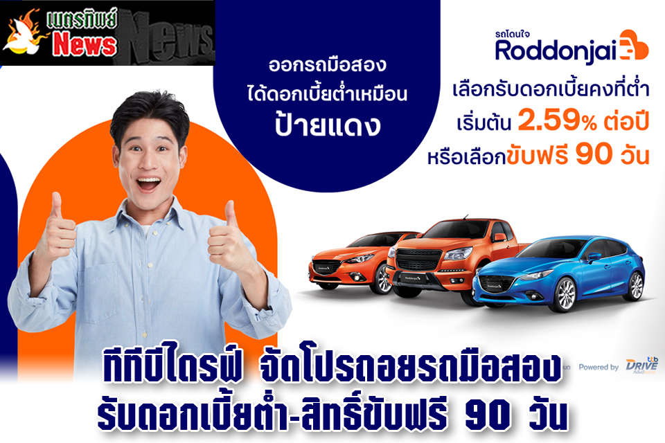 ผู้สื่อข่าวรายงานว่า ทีทีบีไดรฟ์ โดยทีเอ็มบีธนชาต มุ่งมั่นในการดูแลลูกค้าที่ใช้รถตลอดทุกช่วงเวลา เพื่อให้ชีวิตทางการเงินดีขึ้น สำหรับผู้ที่กำลังมองหารถยนต์มือสอง คุณภาพดี มาตรฐานเป็นกลาง ชวนมาออกรถยนต์มือสองที่เว็บไซต์ “รถโดนใจ” แพลตฟอร์มซื้อขายรถยนต์มือสอง ที่สร้างความมั่นใจทั้งเรื่องคุณภาพรถและราคากับทั้งผู้ซื้อและผู้ขาย พร้อมจัด สินเชื่อรถยนต์ใช้แล้วกับทีทีบีไดรฟ์ พิเศษ ได้ดอกเบี้ยต่ำเหมือนป้ายแดง! เลือกรับดอกเบี้ยคงที่ เริ่มต้น 2.59% ต่อปี หรือ ขับฟรี 90 วัน เมื่อสมัครสินเชื่อรถยนต์ใช้แล้วทีทีบีไดรฟ์ ตั้งแต่ 1–30 มิถุนายน 2566 อนุมัติและเกิดสัญญาภายใน 31 กรกฎาคม 2566 โดยมีรายละเอียด ดังนี้