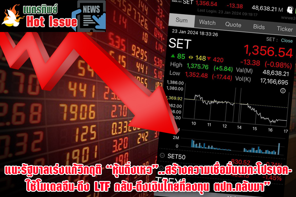 วันนี้ (23 มกราคม 2567) SET ลบ 13.38 จุด ปิด 1,356.54 จุด มูลค่าการซื้อขาย 48,638.21 ล้านบาท โดยตลาดหุ้นไหลลงอย่างเนื่อง ทำนิวโลว์ของปีไปเรื่อยๆ นักลงทุนต่างชาติเทขายหุ้นออกมาไม่หมดสักที