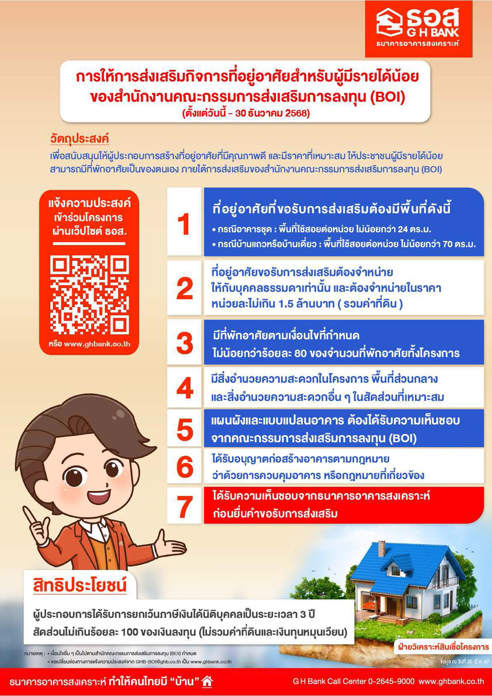 5. การให้การส่งเสริมกิจการที่อยู่อาศัยสำหรับผู้มีรายได้น้อย (โครงการบ้าน BOI) คณะกรรมการส่งเสริมการลงทุนได้ออกประกาศที่ ส. 1/2567 ลงวันที่ 15 มีนาคม 2567 ให้สิทธิประโยชน์ทางภาษีแก่ผู้ประกอบการอสังหาริมทรัพย์ โดยได้รับการยกเว้นภาษีเงินได้นิติบุคคลเป็นระยะเวลา 3 ปี ในวงเงิน ไม่เกินร้อยละ 100 ของเงินลงทุน (ไม่รวมค่าที่ดินและทุนหมุนเวียน) สำหรับการสร้างที่อยู่อาศัยสำหรับผู้มีรายได้น้อยตามหลักเกณฑ์และเงื่อนไข เช่น 1) ที่อยู่อาศัยที่ขอรับการส่งเสริม กรณีอาคารชุดต้องมีพื้นที่ใช้สอยไม่น้อยกว่า 24 ตารางเมตร และกรณีบ้านเดี่ยวหรือบ้านแถว ต้องพื้นที่ใช้สอยไม่น้อยกว่า 70 ตารางเมตร 2) การก่อสร้างที่อยู่อาศัย ที่ขอรับการส่งเสริมต้องจำหน่ายให้บุคคลธรรมดาเท่านั้น โดยก่อสร้างที่อยู่อาศัย (รวมค่าที่ดิน) ราคาไม่เกิน 1.5 ล้านบาท 3) ต้องมีที่อยู่อาศัยตามเงื่อนไขที่กำหนดไม่น้อยกว่าร้อยละ 80 ของที่อยู่อาศัยทั้งโครงการ 4) มีแผนผังและแบบแปลน ที่ได้รับความเห็นชอบจากคณะกรรมการ และได้รับการอนุญาตก่อสร้างอาคารตามกฎหมายว่าด้วยการควบคุมอาคารหรือกฎหมายที่เกี่ยวข้อง 5) ต้องยื่นขอรับการส่งเสริมภายในวันทำการสุดท้ายของปี 2568 เป็นต้น