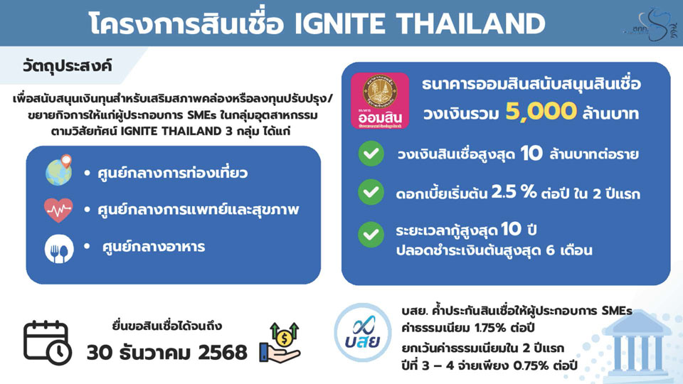 1) โครงการสินเชื่อ IGNITE THAILAND เพื่อสนับสนุนเงินทุนให้แก่ผู้ประกอบการ SMEs ในกลุ่มอุตสาหกรรมตามวิสัยทัศน์ IGNITE THAILAND 3 กลุ่ม ได้แก่ 1) ศูนย์กลางการท่องเที่ยว 2) ศูนย์กลางการแพทย์และสุขภาพ และ 3) ศูนย์กลางอาหาร โดยธนาคารออมสินสนับสนุนสินเชื่อวงเงินรวม 5,000 ล้านบาท วงเงินสินเชื่อต่อรายสูงสุด 10 ล้านบาท อัตราดอกเบี้ยเริ่มต้นร้อยละ 2.5 ต่อปี ใน 2 ปีแรก ระยะเวลากู้สูงสุดไม่เกิน 10 ปี ปลอดชำระเงินต้นสูงสุดไม่เกิน 6 เดือน โดยบรรษัทประกันสินเชื่ออุตสาหกรรมขนาดย่อม (บสย.) ค้ำประกันสินเชื่อให้ผู้ประกอบการ SMEs ที่ได้รับสินเชื่อตามโครงการ อัตราค่าธรรมเนียมร้อยละ 1.75 ต่อปี โดยได้รับการยกเว้นยกเว้นค่าธรรมเนียมใน 2 ปีแรก และปีที่ 3 – 4 จ่ายค่าธรรมเนียมร้อยละ 0.75 ต่อปี สามารถยื่นขอสินเชื่อได้จนถึงวันที่ 30 ธันวาคม 2568
