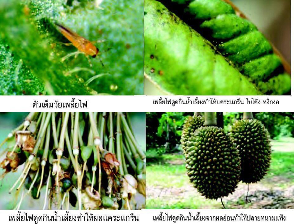โดยเพลี้ยไฟทั้งตัวอ่อนและตัวเต็มวัยดูดกินน้ำเลี้ยงจากส่วนต่างๆ ของพืช มีผลทำให้ใบอ่อนหรือยอดอ่อนชะงักการเจริญเติบโต แคระแกร็น ใบโค้ง แห้งหงิกงอ และไหม้ การทำลายในช่วงดอก ทำให้ดอกแห้ง ดอกและก้านดอกเปลี่ยนเป็นสีน้ำตาลแคระแกร็น และร่วงได้ และในช่วงผลอ่อน ทำให้ชะงักการเจริญเติบโต หนามเป็นแผลและเกิดอาการปลายหนามแห้ง ผลไม่สมบูรณ์และแคระแกร็น เพลี้ยไฟจะระบาดรุนแรงในช่วงแล้ง ซึ่งตรงกับระยะที่ต้นทุเรียนออกดอกติดผล เพลี้ยไฟมีอาหารอย่างอุดมสมบูรณ์ สามารถเพิ่มปริมาณได้มาก