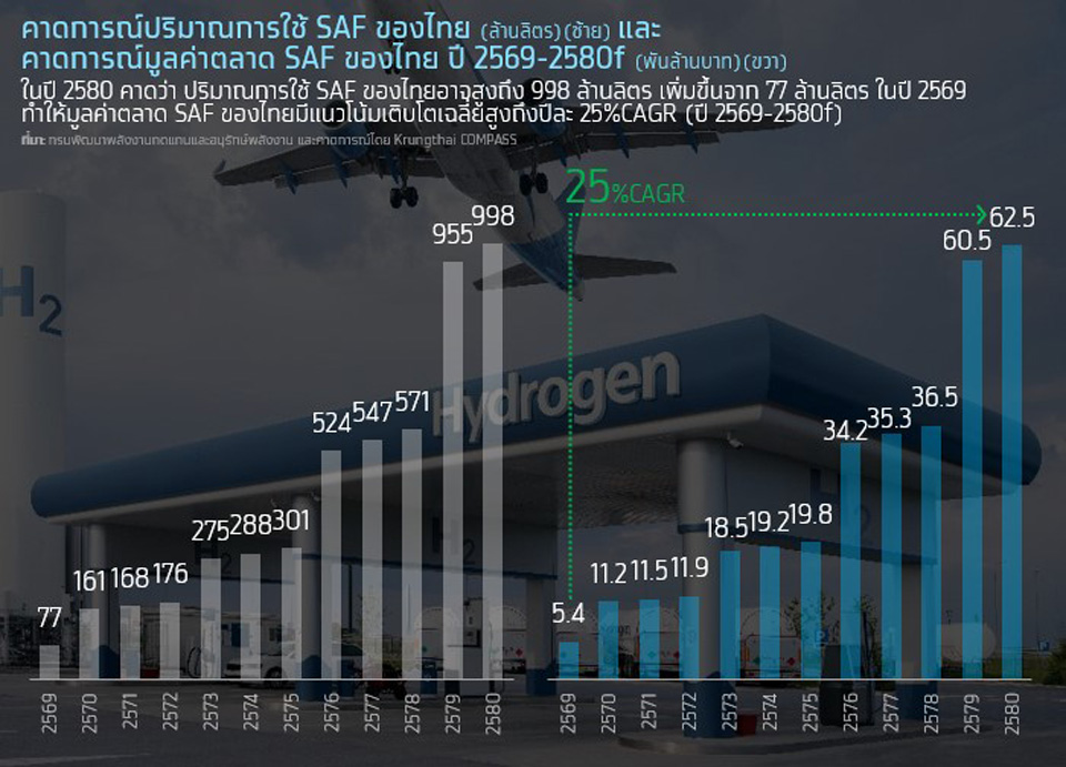 จากเป้าหมายการใช้ SAF ของภาครัฐ และการลงทุนของบริษัทผู้ผลิตเชื้อเพลิงชีวภาพของไทยที่เพิ่มขึ้น ทำให้มูลค่าตลาด SAF ของไทยมีแนวโน้มเติบโต โดย Krungthai COMPASS ประเมินว่า ในปี 2580 มูลค่าตลาด SAF ของไทยจะอยู่ที่ราว 6.3 หมื่นล้านบาท จากในปี 2569 ที่คาดว่าจะมีมูลค่า 5.4 พันล้านบาท หรือมีอัตราการเติบโตเฉลี่ยสูงถึงปีละ 25%CAGR โดยมีวิธีประเมินดังนี้