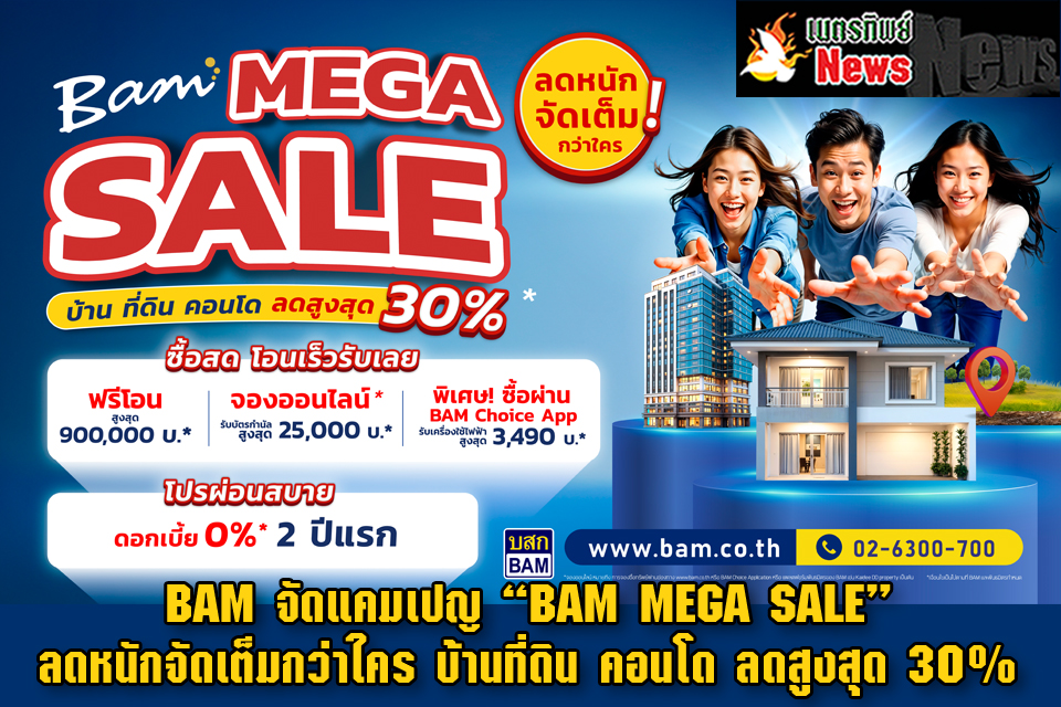BAM จัดแคมเปญ “BAM MEGA SALE” ลดหนักจัดเต็มกว่าใคร ลดสูงสุด 30% ตั้งแต่วันนี้ ถึง 15 พฤษภาคม 2568 คัดทรัพย์คุณภาพ ทำเลดี ทั่วประเทศ ทั้ง บ้าน ที่ดิน คอนโด และอสังหาฯ เพื่อการลงทุน จำนวนกว่า 3,000 รายการ มาลดราคาแบบลดหนักจัดเต็มให้ลูกค้าเลือกช้อปอย่างจุใจ พร้อมรับโปร “โอนเร็ว รับเลย” ฟรีค่าโอนสูงสุด 900,000 บาทต่อรายการทรัพย์ และเมื่อจองซื้อทรัพย์ผ่านช่องทาง Online : เว็บไซต์ รับบัตรกำนัลมูลค่าสูงสุด 25,000 บาท พิเศษ ขณะที่จองซื้อทรัพย์ผ่านช่องทาง Online : BAM Choice Application รับฟรีเครื่องใช้ไฟฟ้า SHARP มูลค่าสูงสุด 3,490 บาท พร้อมขยายเวลาโปรผ่อน 0 % นาน 2 ปี