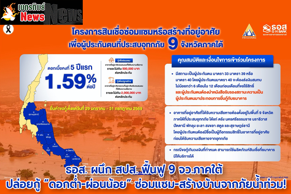 ธอส. ผนึก สปส. ฟื้นฟู 9 จว.ภาคใต้ ปล่อยกู้ “ดอกต่ำ-ผ่อนน้อย” ซ่อมแซม-สร้างบ้านจากภัยน้ำท่วม!