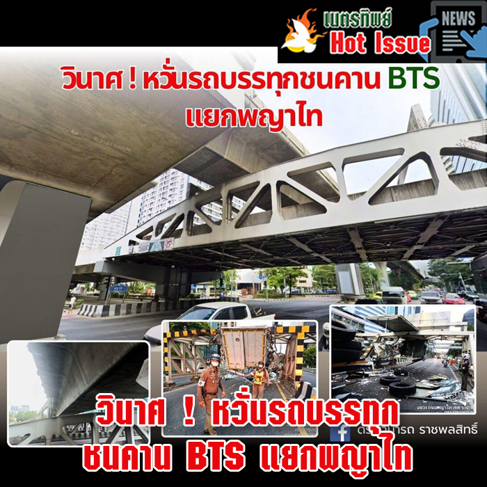 วินาศ ! หวั่นรถบรรทุกชนคาน BTS แยกพญาไท
