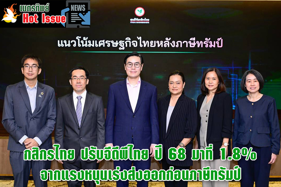 นางสาวณัฐพร ตรีรัตน์ศิริกุล รองกรรมการผู้จัดการ บริษัท ศูนย์วิจัยกสิกรไทย จำกัด ระบุว่า ศูนย์วิจัยกสิกรไทยปรับประมาณการเศรษฐกิจไทยปี 2568 มาอยู่ที่ 1.8% จาก 1.5% จากแรงหนุนการเร่งส่งออกไปยังสหรัฐฯ ก่อนมาตรการภาษีฯ ตามมาตรา 232 และภาษีสินค้าอ้อมผ่านประเทศที่สาม (Transshipment) มีผลบังคับใช้ ทั้งนี้ การส่งออกที่ชะลอตัวลงน้อยกว่าที่คาดในช่วงครึ่งปีหลัง 2568 ส่งผลให้ความเสี่ยงที่เศรษฐกิจไทยจะเข้าสู่ภาวะถดถอยทางเทคนิคนั้น ลดต่ำลง อย่างไรก็ตาม เศรษฐกิจไทยในระยะข้างหน้า ยังมีความท้าทายจากผลกระทบทางตรงและทางอ้อมจากภาษีสหรัฐฯ การท่องเที่ยวที่ชะลอตัว และปัจจัยทางการเมือง ที่ยังต้องติดตาม ขณะที่ ทิศทางอัตราดอกเบี้ยนโยบายในระยะที่เหลือของปี 2568 นั้น มองว่า กนง.มีโอกาสปรับลดอัตราดอกเบี้ยนโยบายลงอีก 1 ครั้งในปีนี้ ซึ่งมาควบคู่กับนโยบายกระตุ้นเศรษฐกิจเฉพาะหน้าของรัฐบาลใหม่