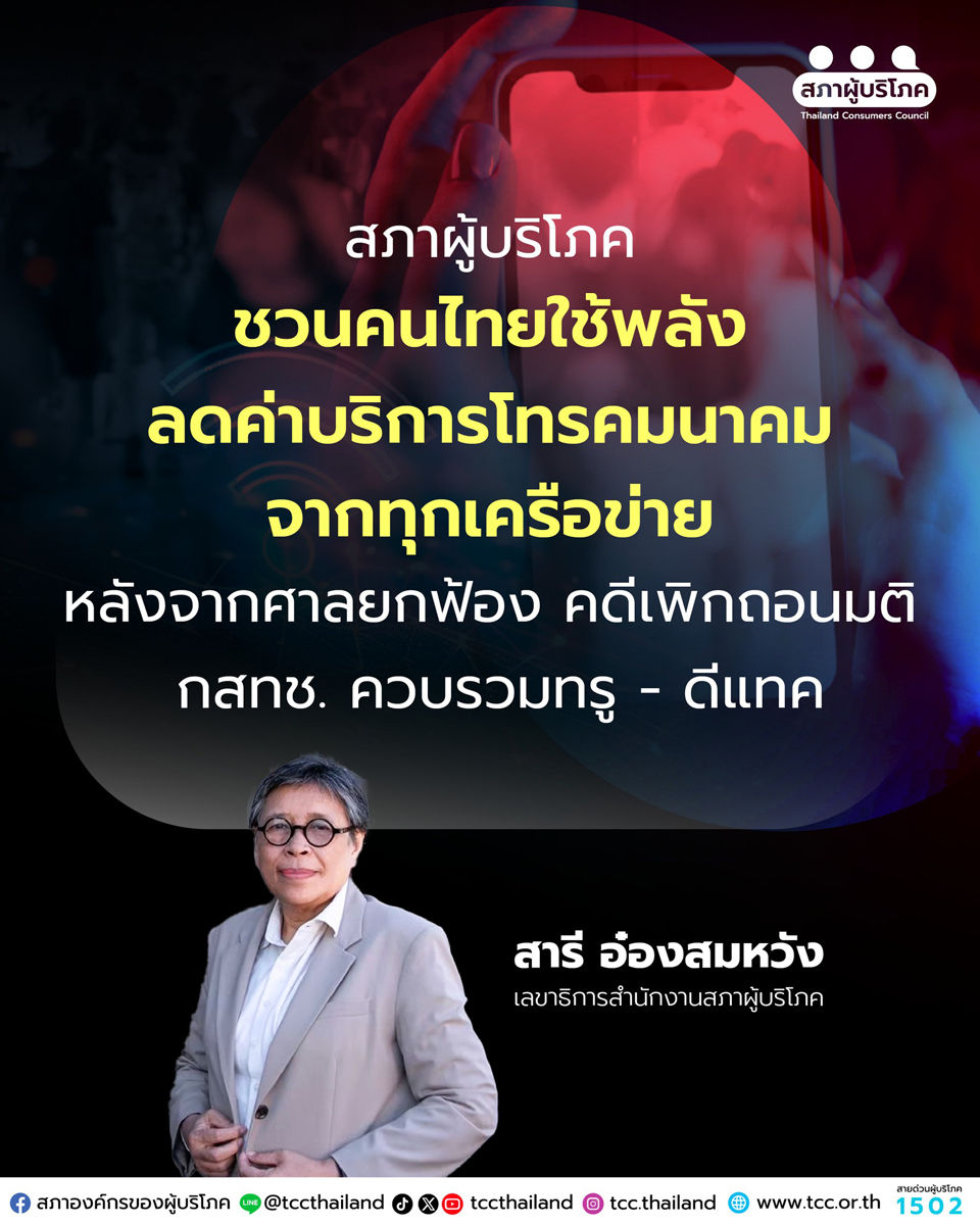 ชี้มติชอบด้วย กม. - มีการออกมาตรการเฉพาะ ขณะที่สภาผู้บริโภคยื่นอุทธรณ์ฯ พร้อมชวนผู้บริโภคโทรหาค่ายมือถือลดราคาแพ็กเกจ
